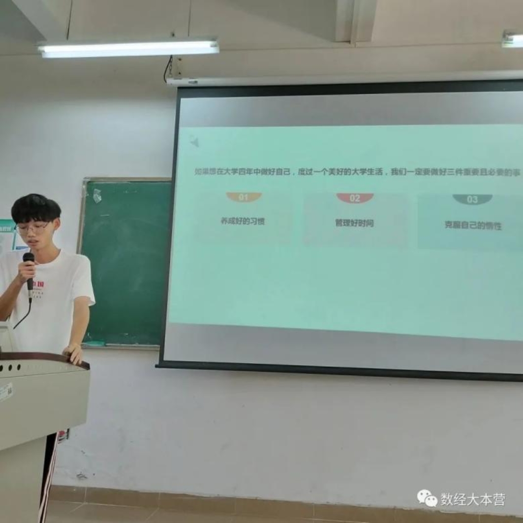 活动伊始,由一班班长钟祖阳同学为大家讲述“大学是什么”、“大学应该怎么度过”、“大学应该学会什么”、“新生适应期怎么过”。祖阳同学告诉我们,行动是对抗焦虑的良药,躺平和拖延心态会严重影响做事效率,我们应该以良好的精神面貌迎接新生活和新挑战,踔厉奋发,笃行不怠。