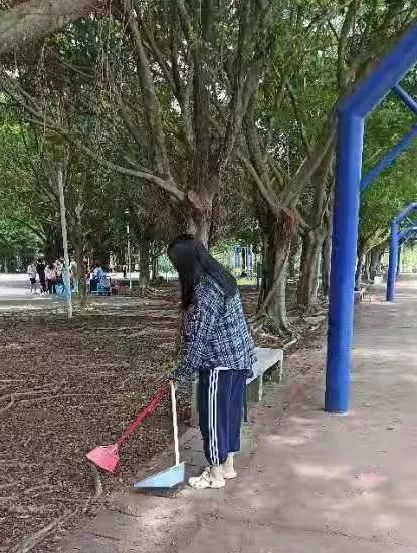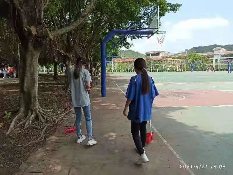 活动分场——西体及附近篮球场,在团支书黎映形的带领下,“小蜜蜂们”享受着春日和煦,微风拂面,不仅用辛勤的汗水换来了干净整洁的运动场,还眼疾手快,用自己的火眼金睛,把纸巾、塑料瓶从落叶中揪出来,不允许它们在里面滥竽充数。