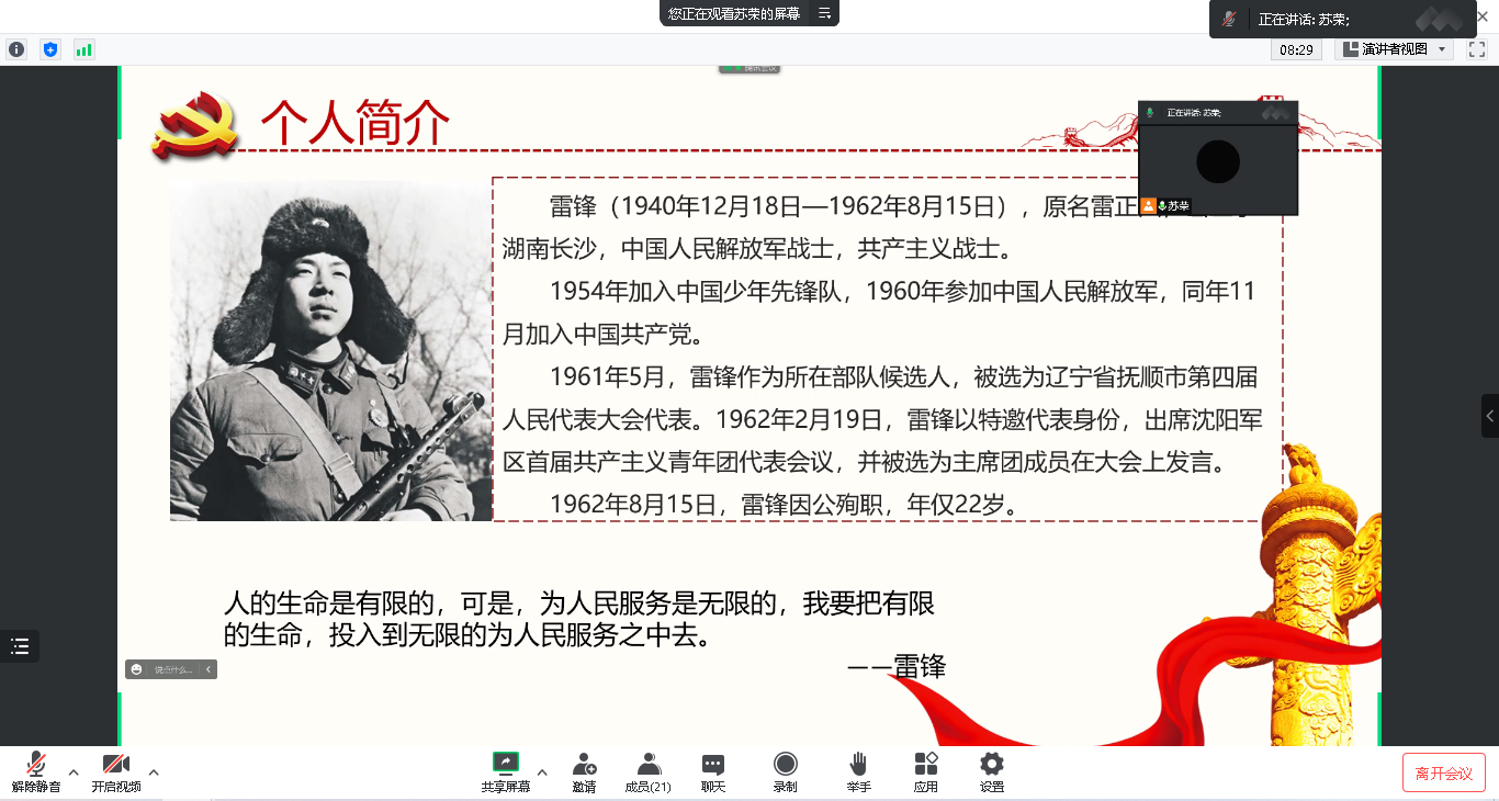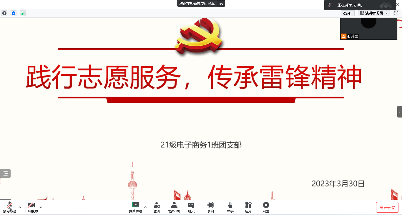 为进一步保持和促进团员的积极性,引导团员学习雷锋精神,把崇高理想信念融入行动,21级电子商务本团支部于3月30日下午一点展开线上团日活动,学习雷锋精神。