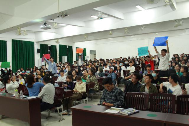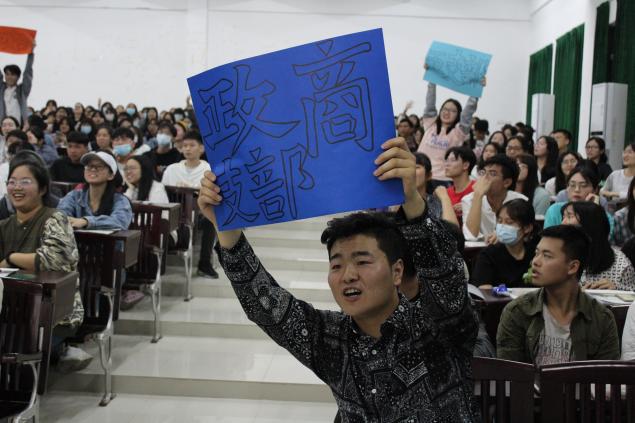 线下作答单选题、多选题时,每题每队派一位参赛队员举牌,通过屏幕上所放出的题目,在主持人喊3秒后同学们举手回答。各支部参赛队员在纷纷举手快速抢题,各组成员讨论出最终答案并作回答复。