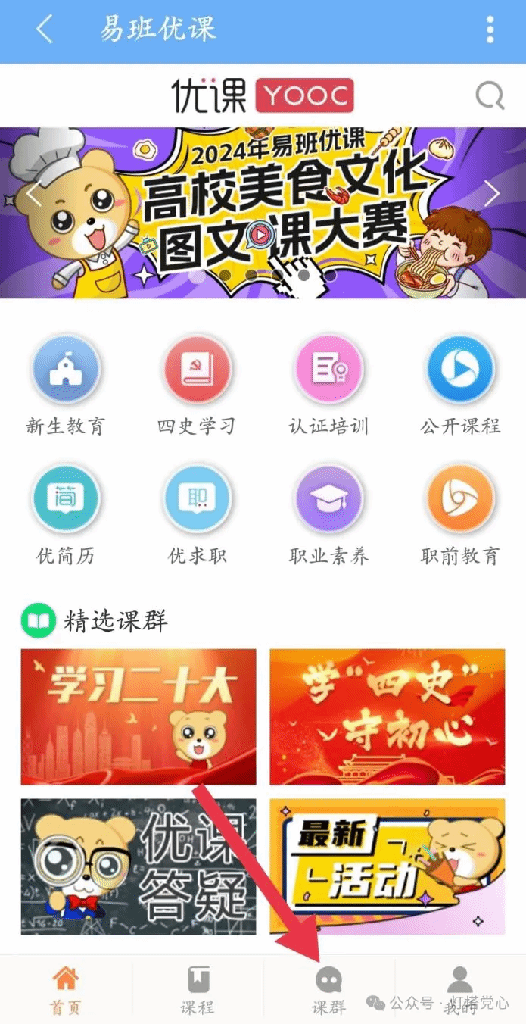 下载易班App并注册→登录进入易班→点击主页面右下角“我的”→进入个人页面后点击“易班优课”→进入优课YOOC后点击右下方“课群”进入课群主页→在课群主页中点击“添加课群”→在添加课群中搜索邀请码KPQJCU9A加入课群→加入各自对应的党支部→完成后在课群首页就可以看到线上的课程