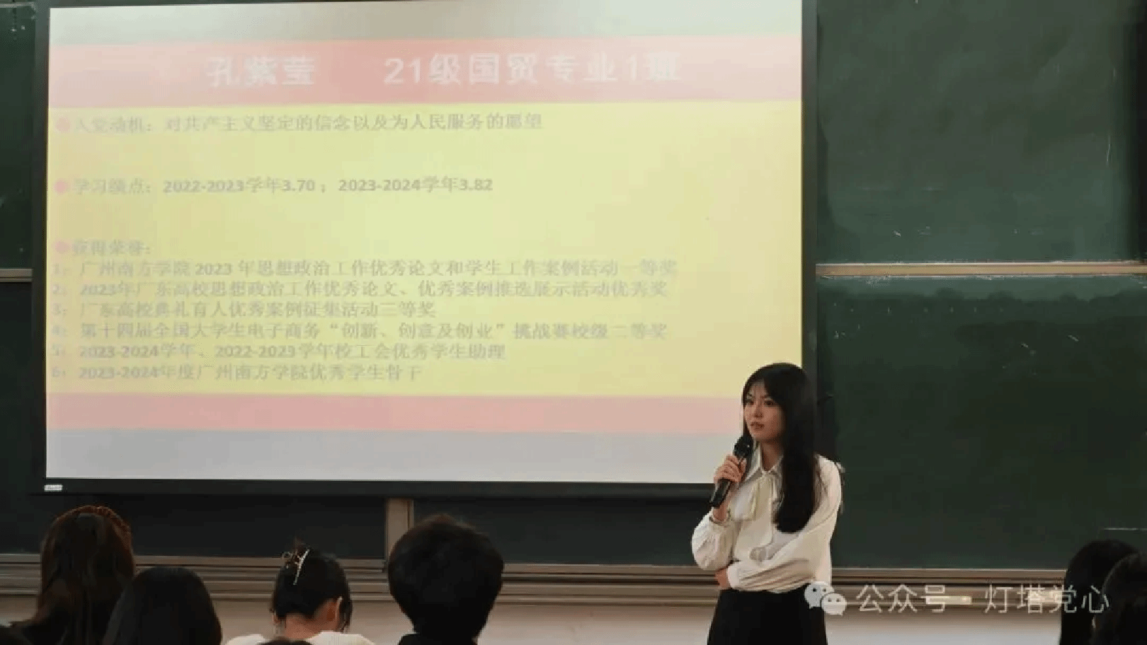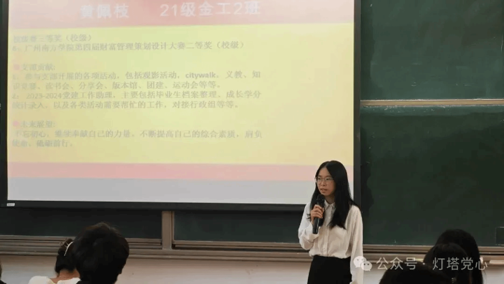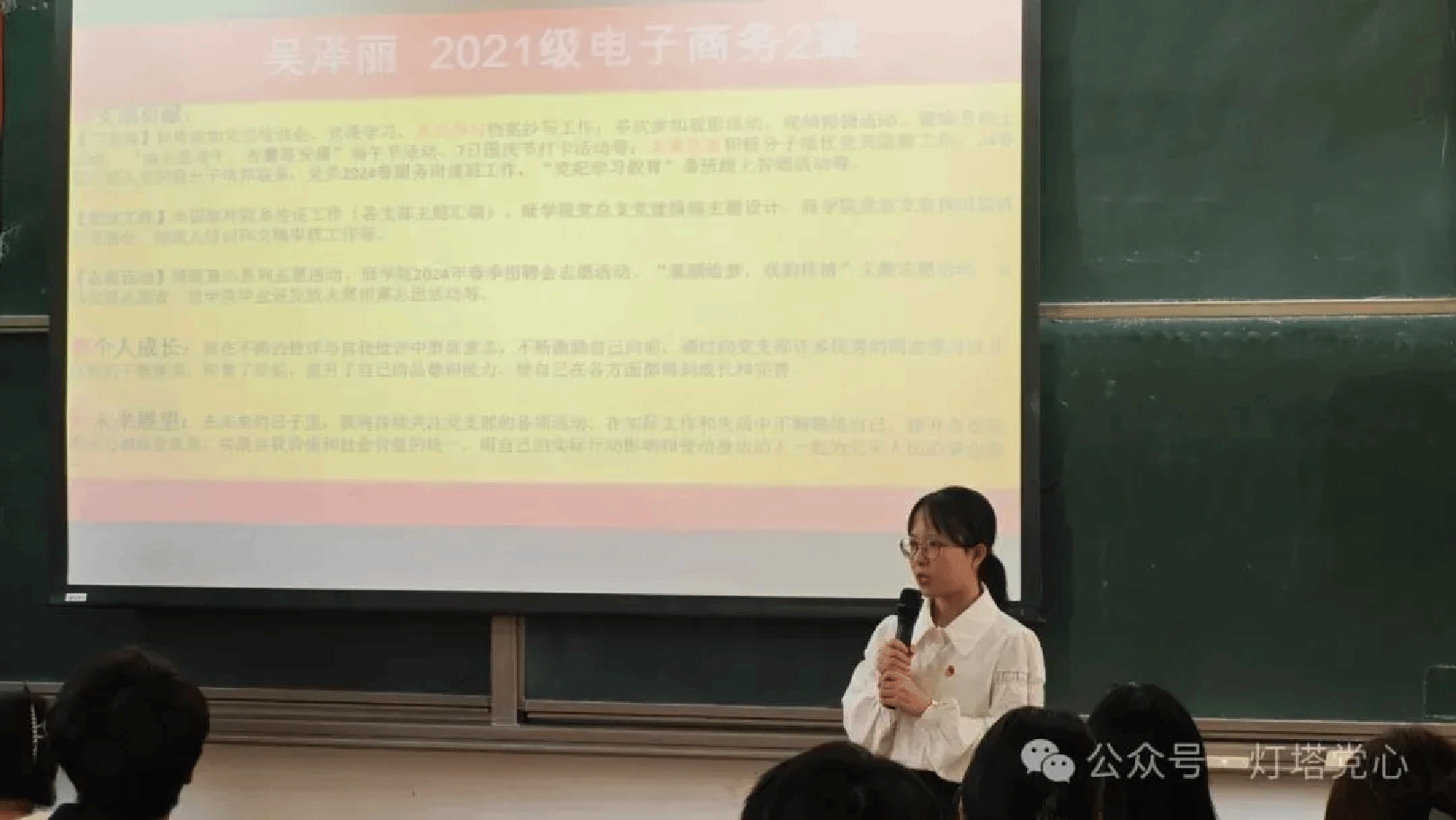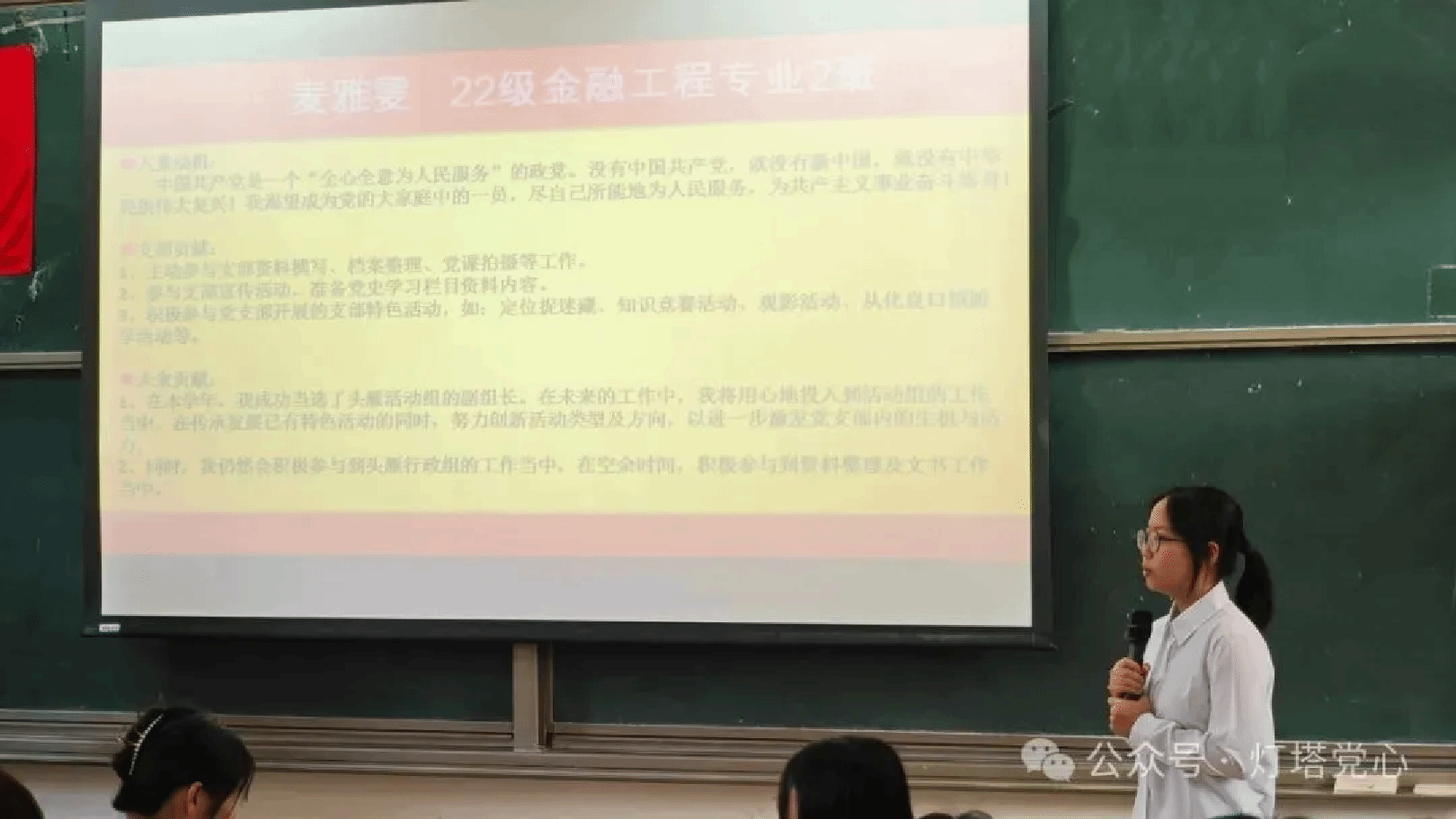红色基因薪火传,党员风采再飞扬。胡梓莹等7名发展对象依次上台做自我汇报,从入党动机、个人经历、学业表现、荣誉奖项以及党支部贡献等维度向党组织表达了自身对党的热爱以及向党组织靠拢的决心。会议上,党支部书记和参会党员对他们的发言进行提问与点评,希望每位发展对象能坚定理想信念,切实做到在思想上和行动上与党组织保持一致。