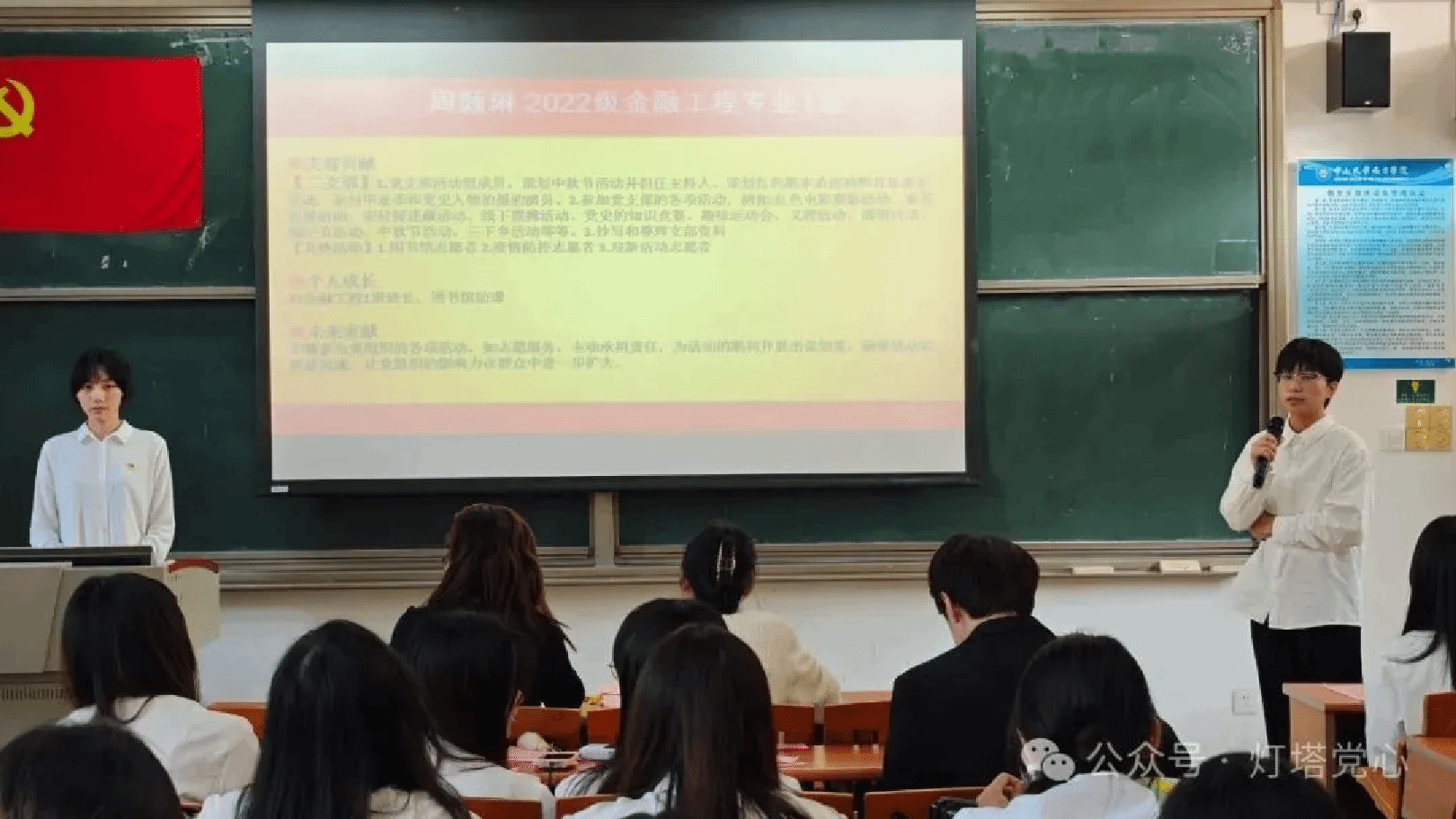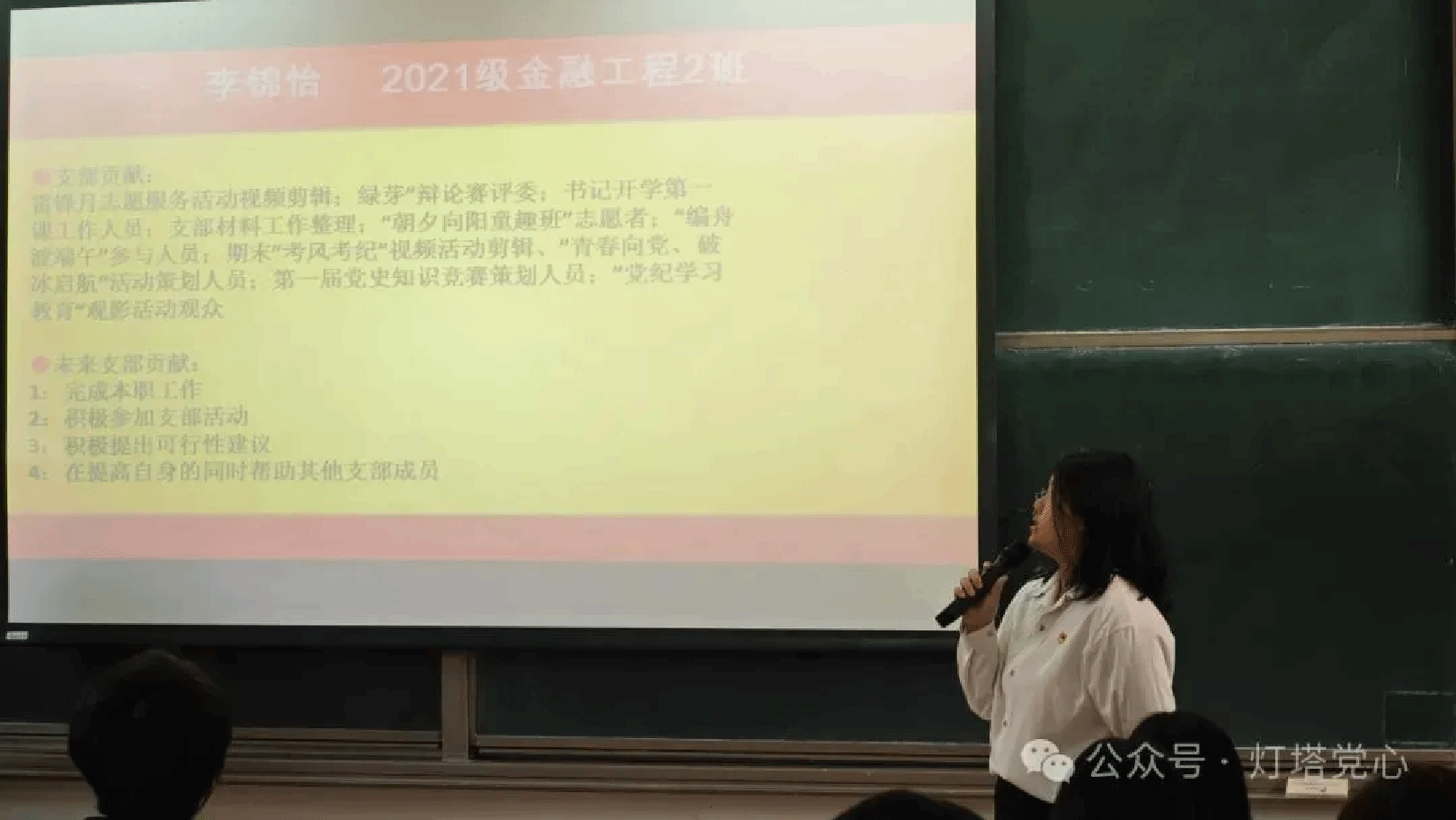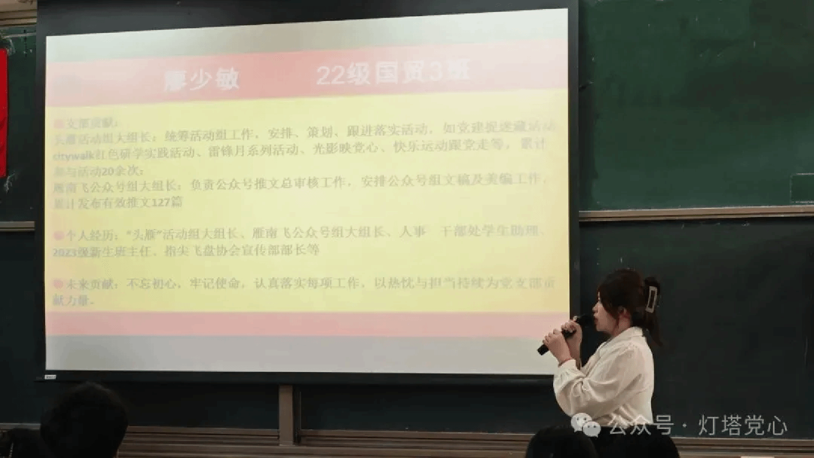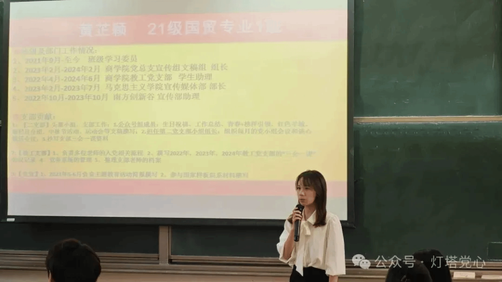 红色基因薪火传,党员风采再飞扬。胡梓莹等7名发展对象依次上台做自我汇报,从入党动机、个人经历、学业表现、荣誉奖项以及党支部贡献等维度向党组织表达了自身对党的热爱以及向党组织靠拢的决心。会议上,党支部书记和参会党员对他们的发言进行提问与点评,希望每位发展对象能坚定理想信念,切实做到在思想上和行动上与党组织保持一致。