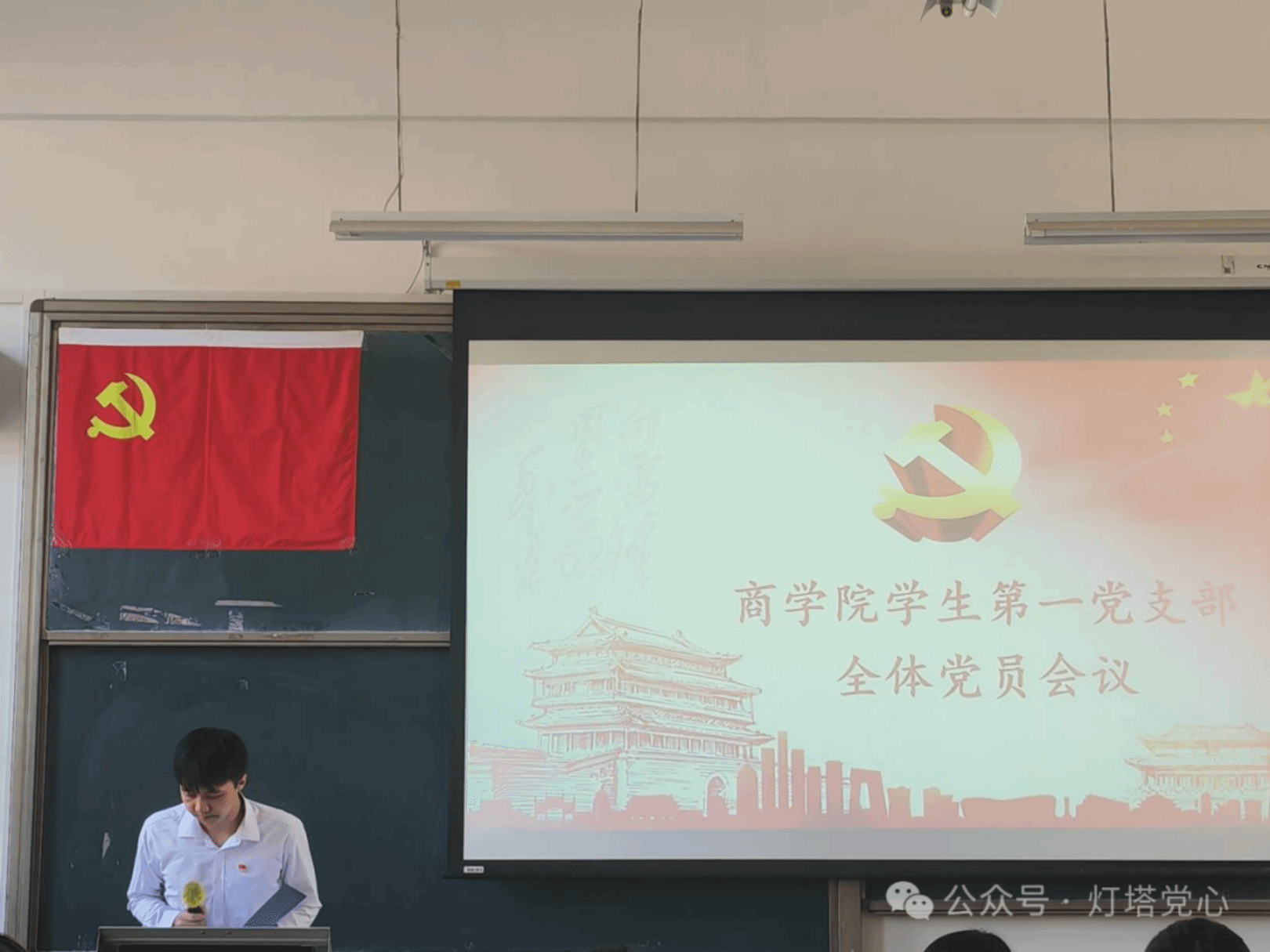 党建工作助理李洋同志宣读会议考勤情况,党建工作助理许诺同志就会议纪律做出强调,宣布会议流程和介绍到场老师后,大会正式开始。