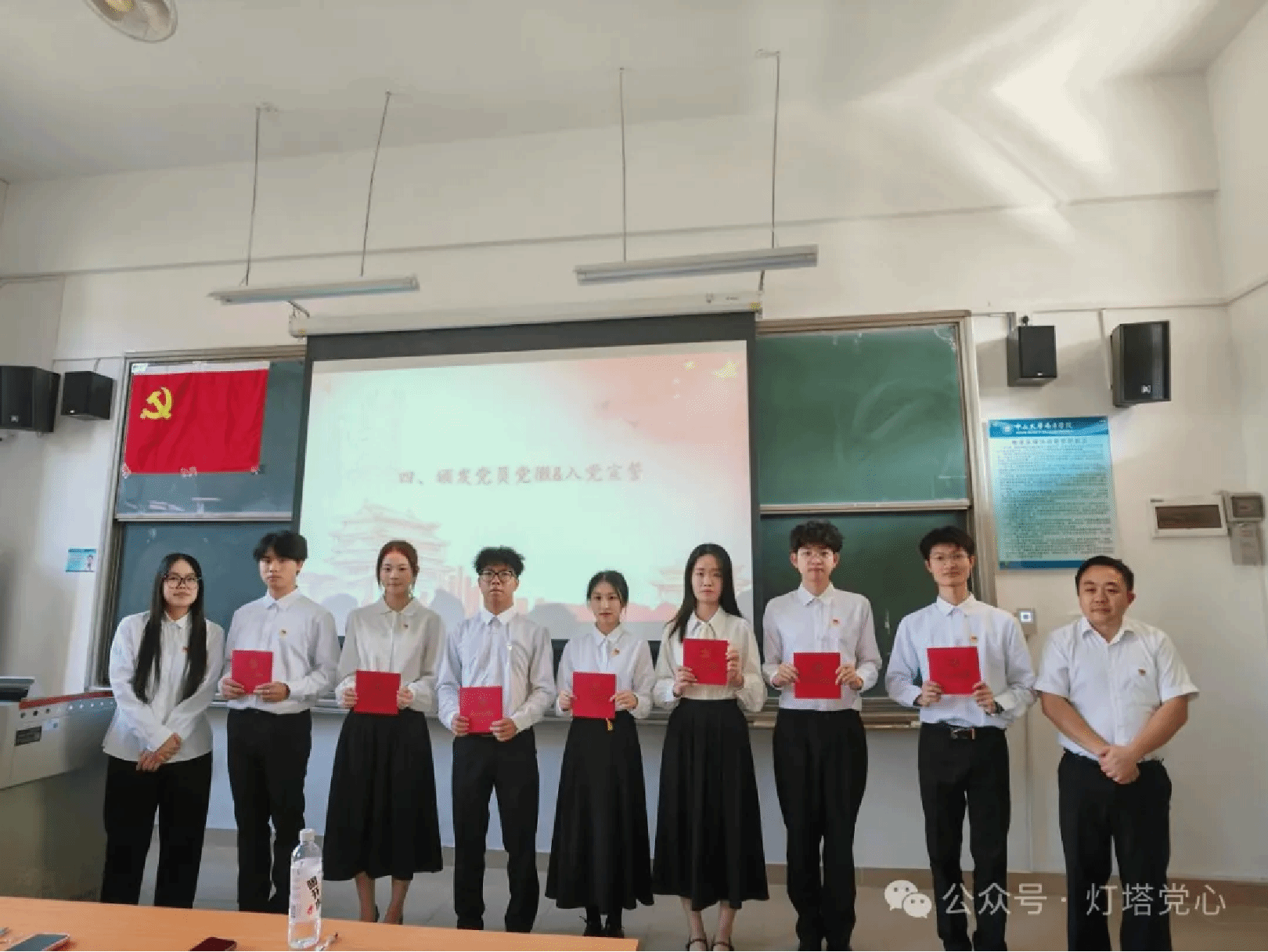 在宣读大会决议后,党支部书记陆正祥老师和党支部副书记杨丽茵老师为新一批预备党员佩戴党员徽章,并引领其面向党旗进行入党宣誓。铮铮誓言,拳拳赤诚,铿锵有力的宣言彰显了他们对党无比坚定的信仰与忠诚,表达了誓与党同心、为党的事业奋斗终身的坚定决心。