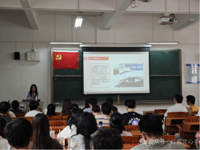 会议开始,由党建工作助理李洋同志全面讲解入党相关事项,涵盖入党流程、条件和要求,使同学们对入党有了清晰的认识。李洋同志还详细说明了入党考察期间的注意事项,帮助入党积极分子明确标准,从而提升自我约束力和管理能力,确保思想和行动与党的要求保持一致。此外,李洋同志针对考察期间注意事项进行了深入阐述,首先强调了参会人员必须按时到场,禁止迟到早退,同时明确请假流程,确保考核工作的专业化和定量化。其次,关于思想汇报方面,入党积极分子需时刻保持思想上的先进性,定期向党组织汇报思想动态,不断学习党的理论知识,并主动与培养联系人进行谈话,以增强自身的政治觉悟,明确自身的奋斗方向。