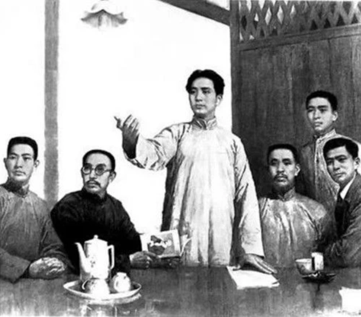 左起依次是王尽美、何叔衡、毛泽东、董必武、邓恩铭、陈潭秋