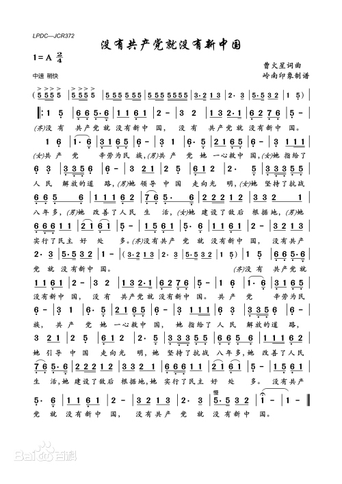 《没有共产党就没有新中国》是由曹火星作曲,属于一部曲式结构的音乐作品。该作品采用了A大调激昂奔放的调式贯穿全曲,中途没有转调,这首歌曲旋律线条简单,起伏不大,值得注意的是每个乐句的尾音都为上行进行,这突出了“没有共产党就没有新中国”的主题。这首歌曲的歌词并没有华丽的辞藻,只是用最真挚的情感描述出中国共产党的心路历程。它的传唱始终伴随着人民军队进军的步伐,伴随着民族解放前进的号角,唱出了中国人民的心声。