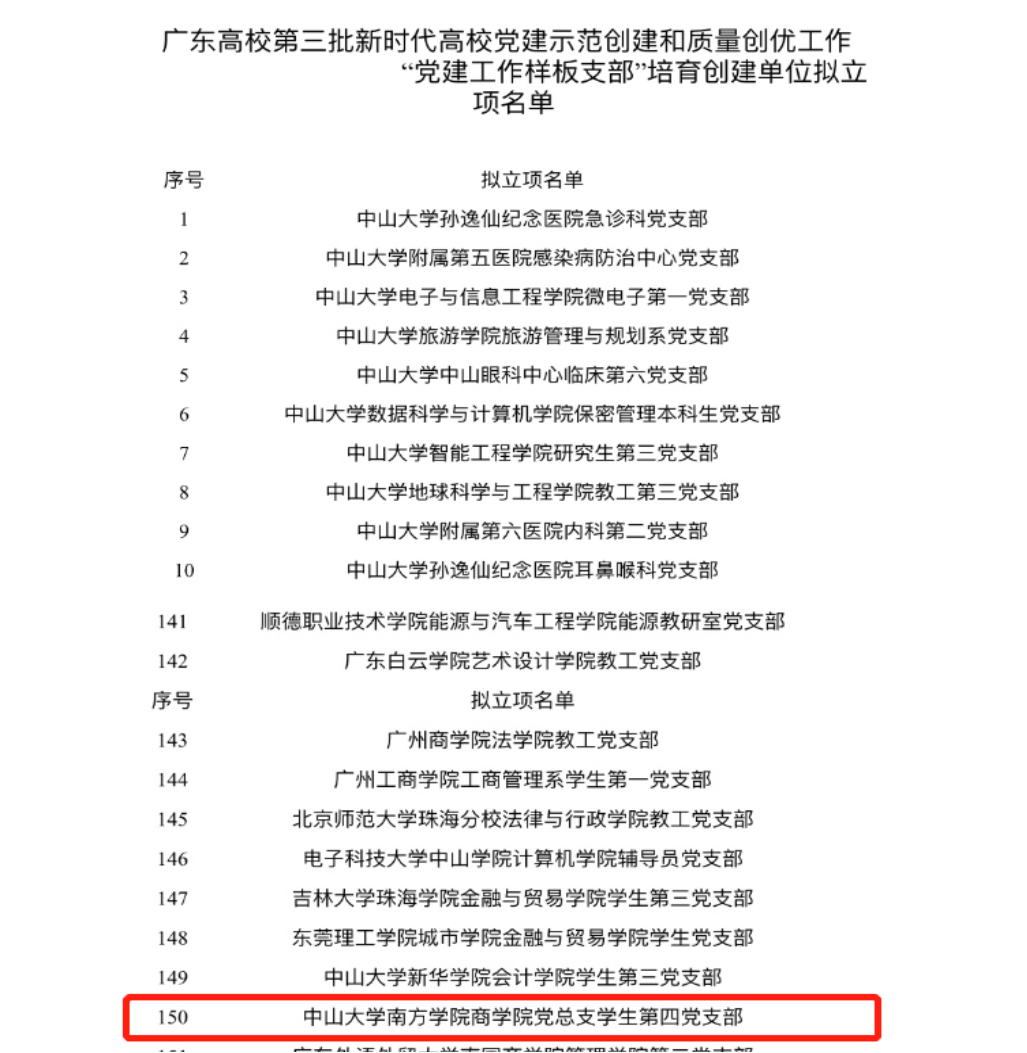 2020年12月7日,中山大学南方学院艾弗森贝博ballbet官网学生第四党支部在“广东高校第三批新时代高校党建示范创建和质量创优工作‘党建工作样板支部’培育创建单位拟立项名单”中光荣上榜。