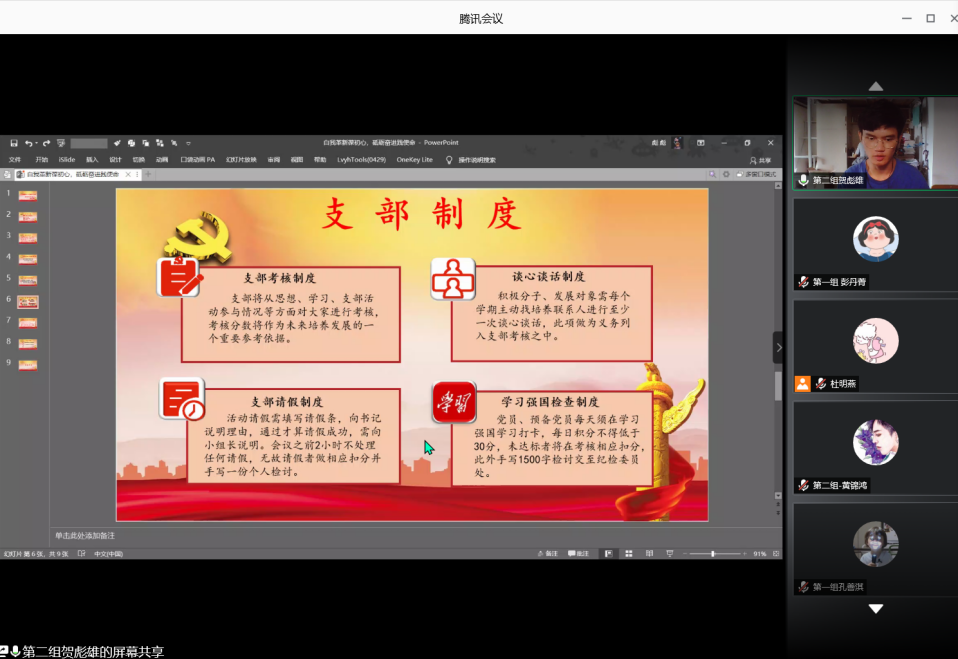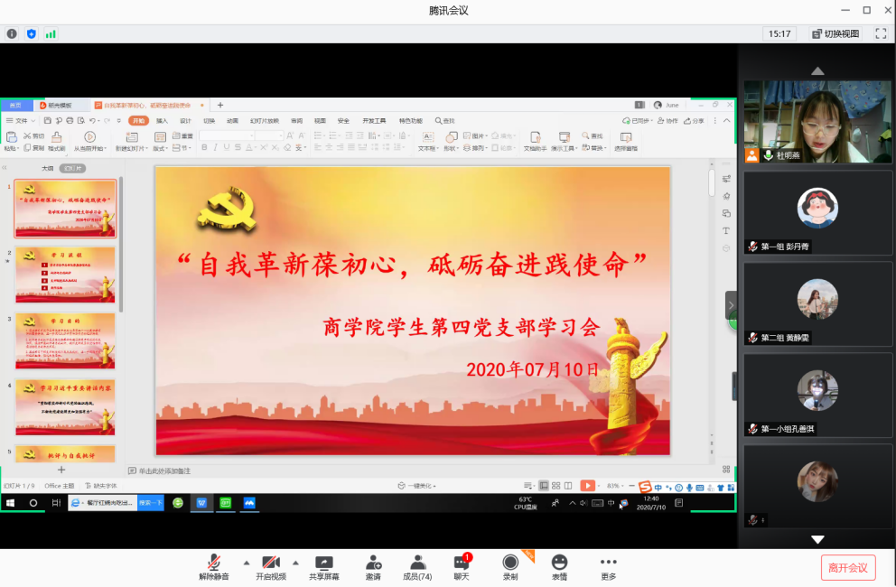 艾弗森贝博ballbet官网学生第四党支部以此为契机,于2020年7月10日中午12点40分通过“腾讯会议”线上视频会议的方式开展了以“自我革新葆初心,砥砺奋进践使命”为主题的支部主题学习会议。参与本次会议的人员有支部副书记张燕老师,学生党员、学生预备党员以及18级全体积极分子。