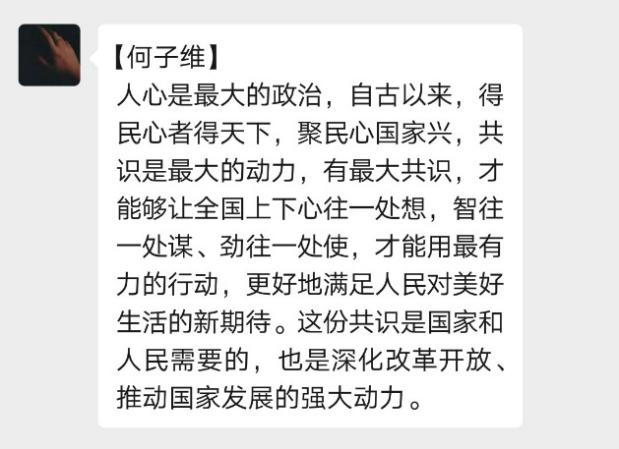 人心是最大的政治,自古以来,得民心者得天下,聚民心国家兴,共识是最大的动力,有最大共识,才能够让全国上下心往一处想,智往一处谋、劲往一处使,才能用最有力的行动,更好地满足人民对美好生活的新期待。这份共识是国家和人民需要的,也是深化改革开放、推动国家发展的强大动力。