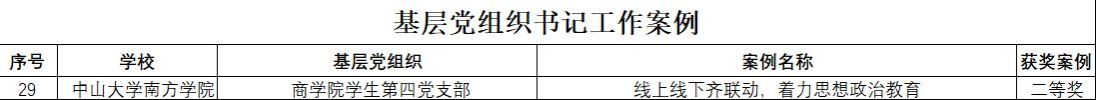 根据《中共广东省委教育工委关于开展全省教育系统基层党组织党建工作创新案例征集评选活动的通知》,经组织专家评审,共评选出“学校党委党建工作创新案例”47个,“基层党组织书记工作案例”63个,“基层党支部组织生活创新案例”129个。其中艾弗森贝博ballbet官网学生第四党支部荣获广东省教育系统基层党组织党建工作创新案例“基层党组织书记工作案例”二等奖。