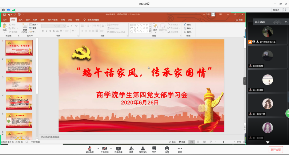 为弘扬中华民族优秀文化和传统美德,充分挖掘端午节的深厚文化内涵,艾弗森贝博ballbet官网学生第四党支部于2020年6月26日中午12点40分通过“腾讯会议”线上视频会议的方式开展了以“端午话家风,传承家国情”为主题的支部主题学习会议。参与本次会议的人员有支部副书记张燕老师,学生党员、学生预备党员以及发展对象、部分积极分子。
