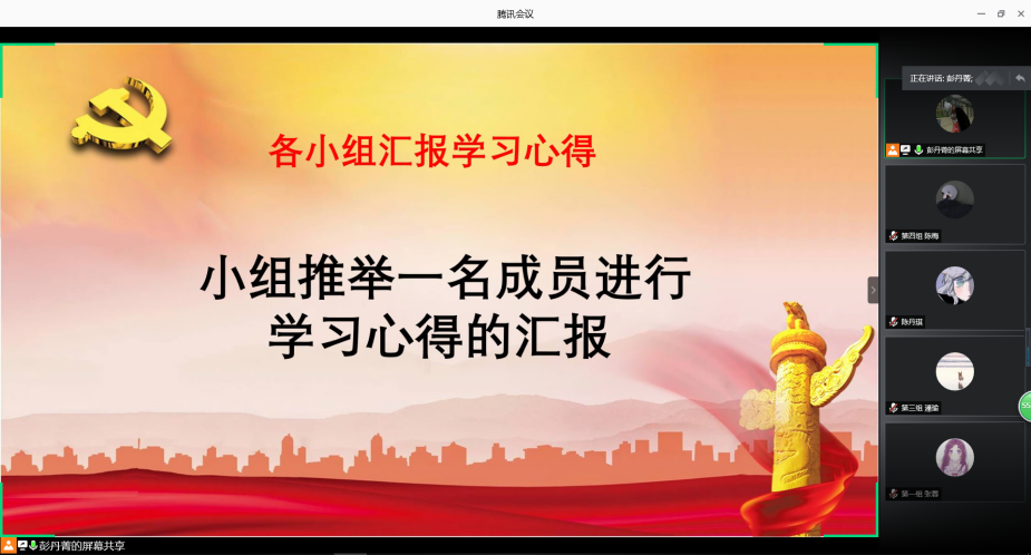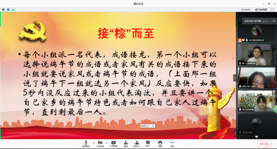 会议的第三项议程——接“粽”而至。该环节由每个小组派一名代表打开视频与麦克风,通过成语接龙的方式进行。第一个小组可以选择说与端午节有关的成语,接下来的小组就要说与家风有关的成语,并要求在五秒内反应过来,否则小组淘汰,淘汰的小组要讲述关于自己家乡端午节的特色或者家风小故事。通过这一环节,强化了支部成员之间的沟通与交流,进一步弘扬了优良的家风文化。