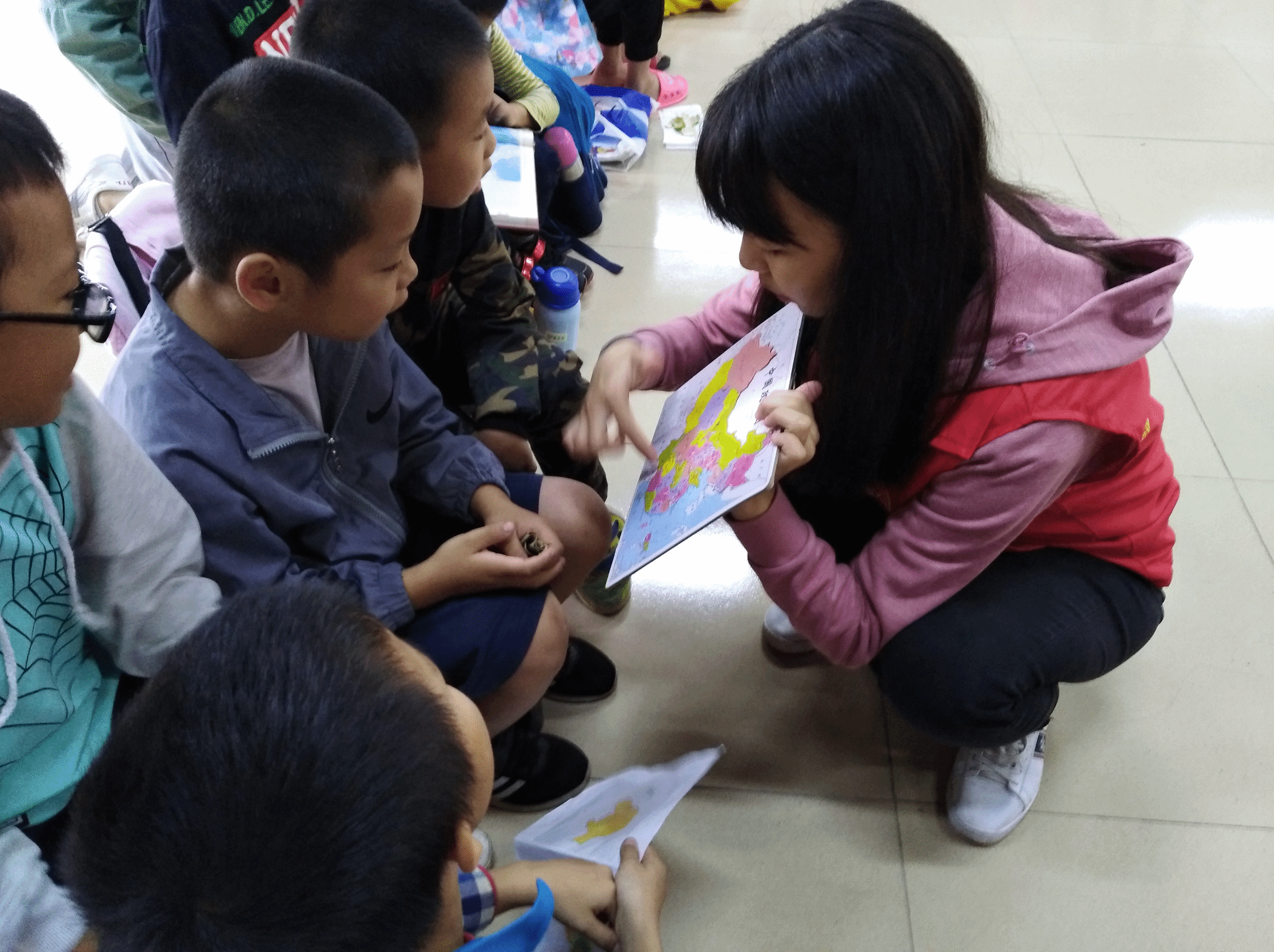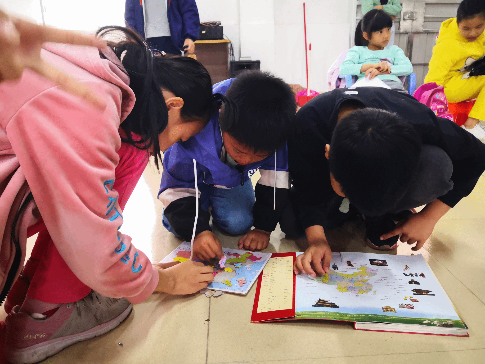 本次活动由六名党员与艾弗森贝博ballbet官网电子商务专业2017级4班团支部共同参与,主要以讲课的方式向小朋友们传授中国地理、中国历史等中国文化知识。地理课由朱文学同志进行讲授,讲课之前,朱文学同志先以浅显易懂的话语向小朋友们介绍了中国地图,之后便展开了分组拼图比赛,小朋友们分为四组,每一组都有一位志愿者负责协助,孩子们对于眼前的“大公鸡”拼图都兴致高昂,纷纷开动脑筋,遇到疑问时也会认真向志愿者们请教,最终,快速地将完整的地图拼好了。通过理论与动手实践相结合的方式,增强了他们对地理知识的了解和对世界探索的求知欲。
