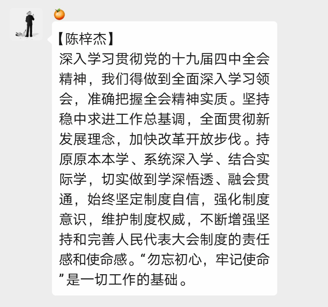 深入学习贯彻党的十九届四中全会精神,我们得做到全面深入学习领会,准确把握全会精神实质。坚持稳中求进工作总基调,全面贯彻新发展理念,加快改革开放步伐。持原原本本学、系统深入学、结合实际学,切实做到学深悟透、融会贯通,始终坚定制度自信,强化制度意识,维护制度权威,不断增强坚持和完善人民代表大会制度的责任感和使命感。“勿忘初心,牢记使命”是一切工作的基础。