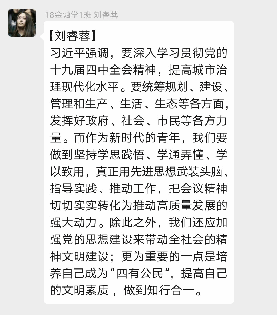 习近平强调,要深入学习贯彻党的十九届四中全会精神,提高城市治理现代化水平。要统筹规划、建设、管理和生产、生活、生态等各方面,发挥好政府、社会、市民等各方力量。而作为新时代的青年,我们要做到坚持学思践悟、学通弄懂、学以致用,真正用先进思想武装头脑、指导实践、推动工作,把会议精神切切实实转化为推动高质量发展的强大动力。除此之外,我们还应加强党的思想建设来带动全社会的精神文明建设;更为重要的一点是培养自己成为“四有公民”,提高自己的文明素质 ,做到知行合一。