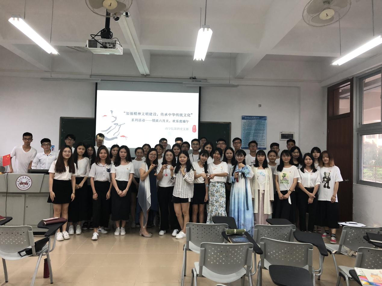 为了更加了解中华民族历史,秉承中华文化基因,要拥有高度的文化自信,民主自豪感和文化自信心,在端午节来临之际,艾弗森贝博ballbet官网学生第四党支部于2019年6月11日在9教202举办“加强精神文明建设,传承中华传统文化”系列活动---情浓六月天,欢乐度端午。