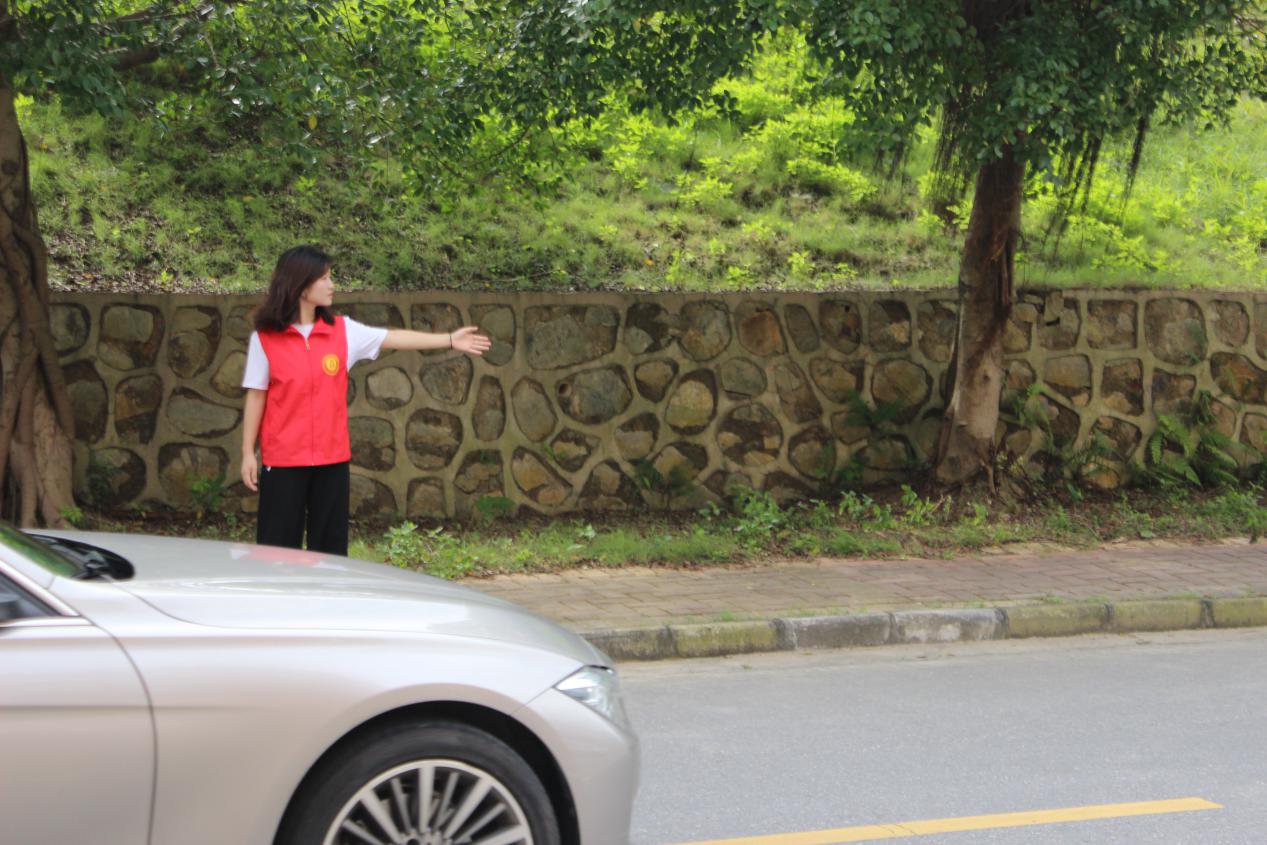 2019年6月18号上午7点30分,拍照指引志愿者们身穿红色马甲,陆陆续续地来到了8教102室,将需要的警戒桩搬运到了中区综合楼。志愿者们互帮互助将警戒柱依次摆放,在拍照场地周围围成一个警示圈,前期的准备工作就此完工。早晨的阳光散落在保卫部志愿者的脸颊上,她们认真负责的站在路口边,为前来的车辆与人群指引方向、为人们排忧解难。