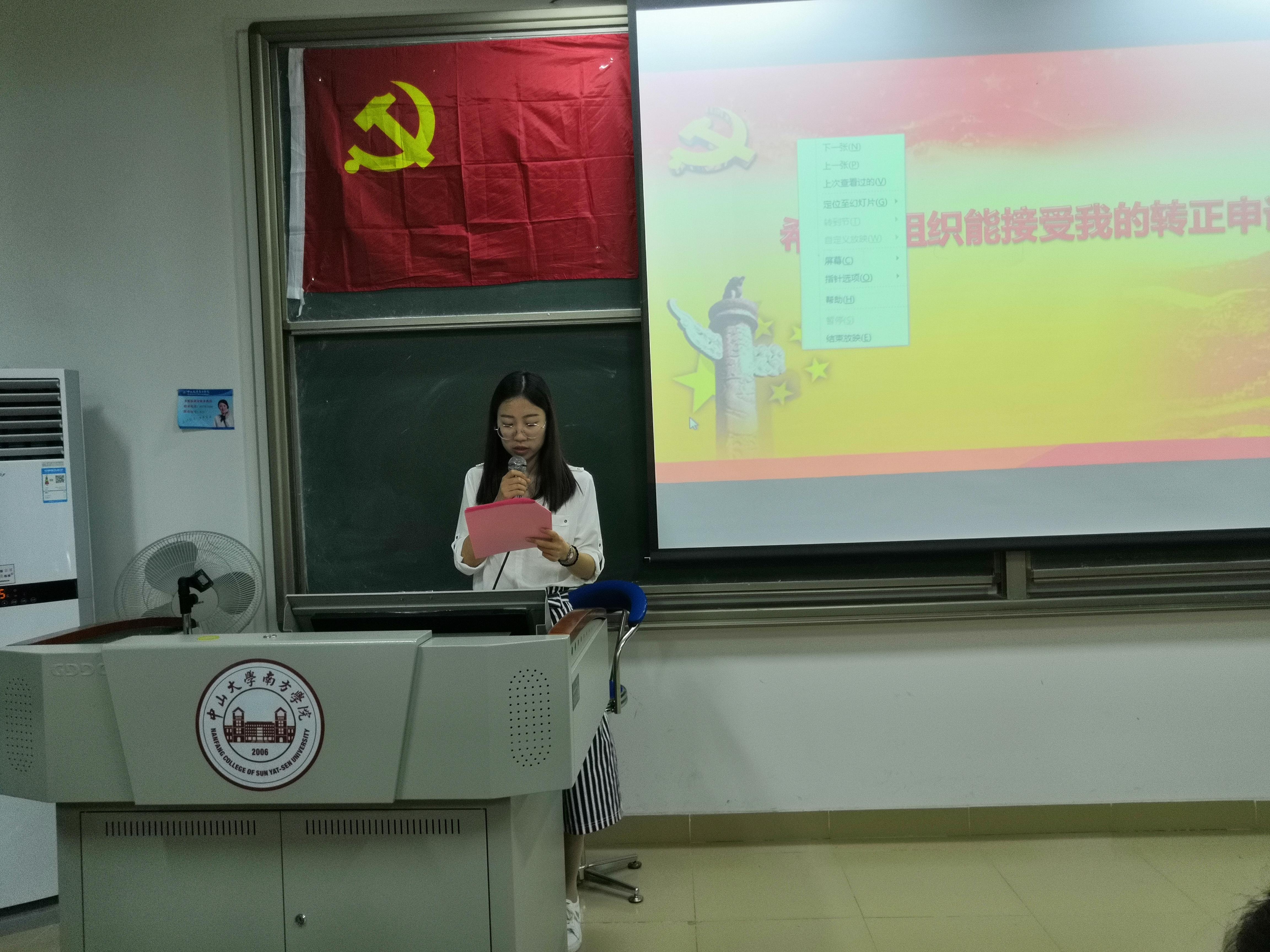 会议的第一项内容即2019年春季预备党员转正。主要对李晓生等7名预备党员提出的转正申请,提出表决。李晓生等7名预备党员依次上台自我汇报,分别从个人在预备期间的思想、学习、工作和支部活动的参与情况等向与会的全体成员进行汇报,表达了自己在学习上、思想上、工作上的积极表现,阐述了自己的入党决心以及全心全意为人民服务的精神。其中杨大德同志讲述了在大学的将近三年以来,如何规划自己的学习以获得两年一等奖学金以及多个等级证书。随后,与会的正式党员代表均对他们作出了评价。