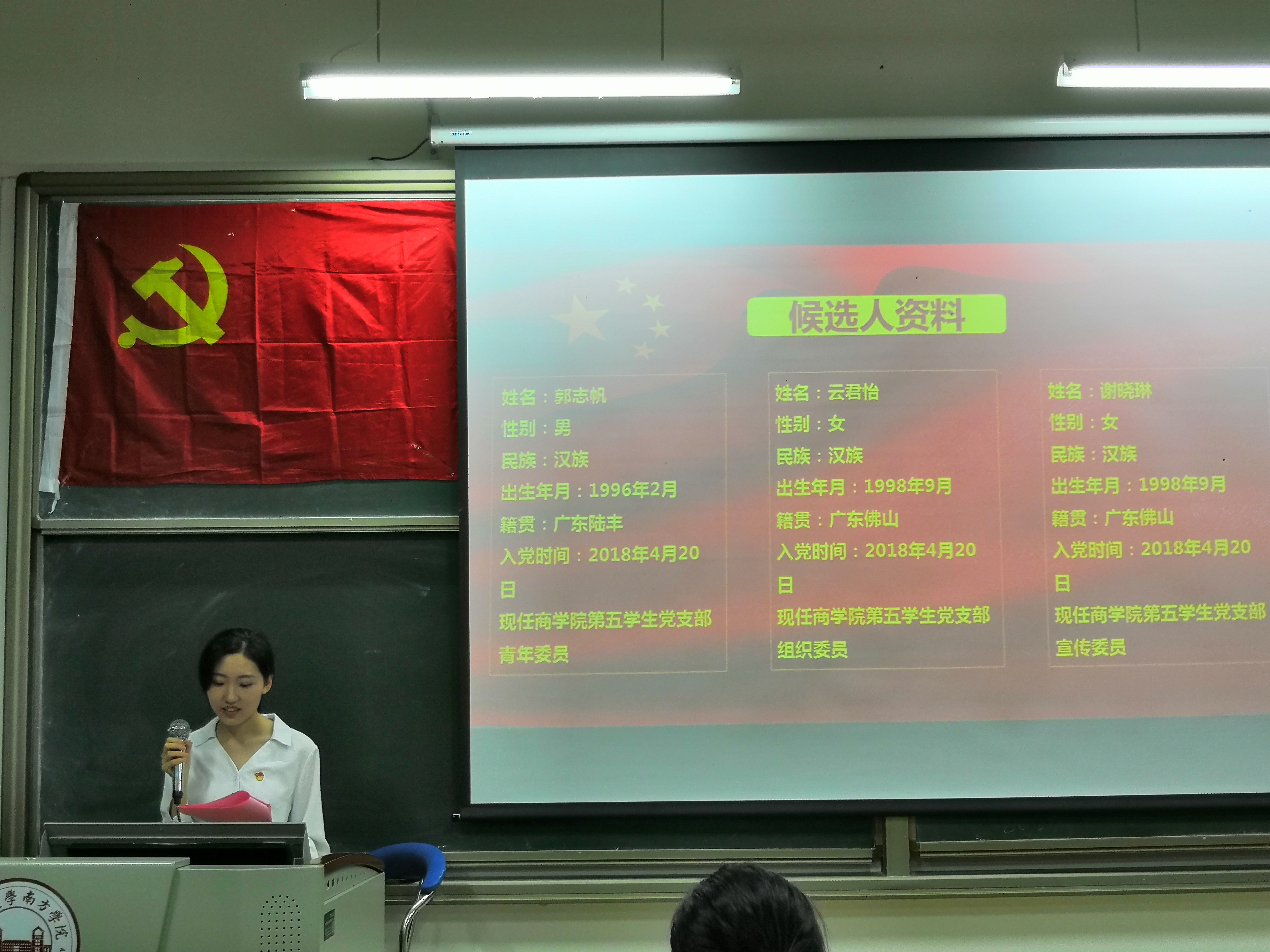 会议第三项内容即支部委员增补,宣传委员余伊玲、组织委员谢瑞安同志、青年委员卢跃曼同志,因毕业原因出现以上职位空缺,特此召开支部委员增补会议,对谢晓琳、云君怡、郭志帆同志,三名预备人选进行表决。
