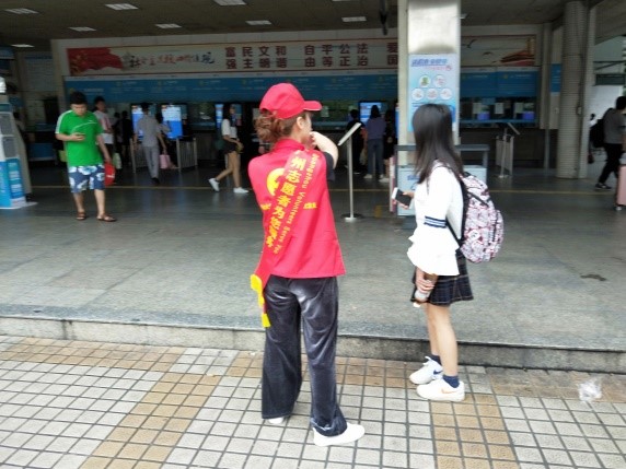 为更好地学习雷锋精神以及把建设服务型党支部落到实处, 2019年5月1日星期三下午,第四支部的预备党员带领着积极分子进行了第四次从化汽车站志愿者服务。虽然是假期,积极分子们依然以饱满的热情、秉持助人为乐的理念去对待每一位需要帮助的人。