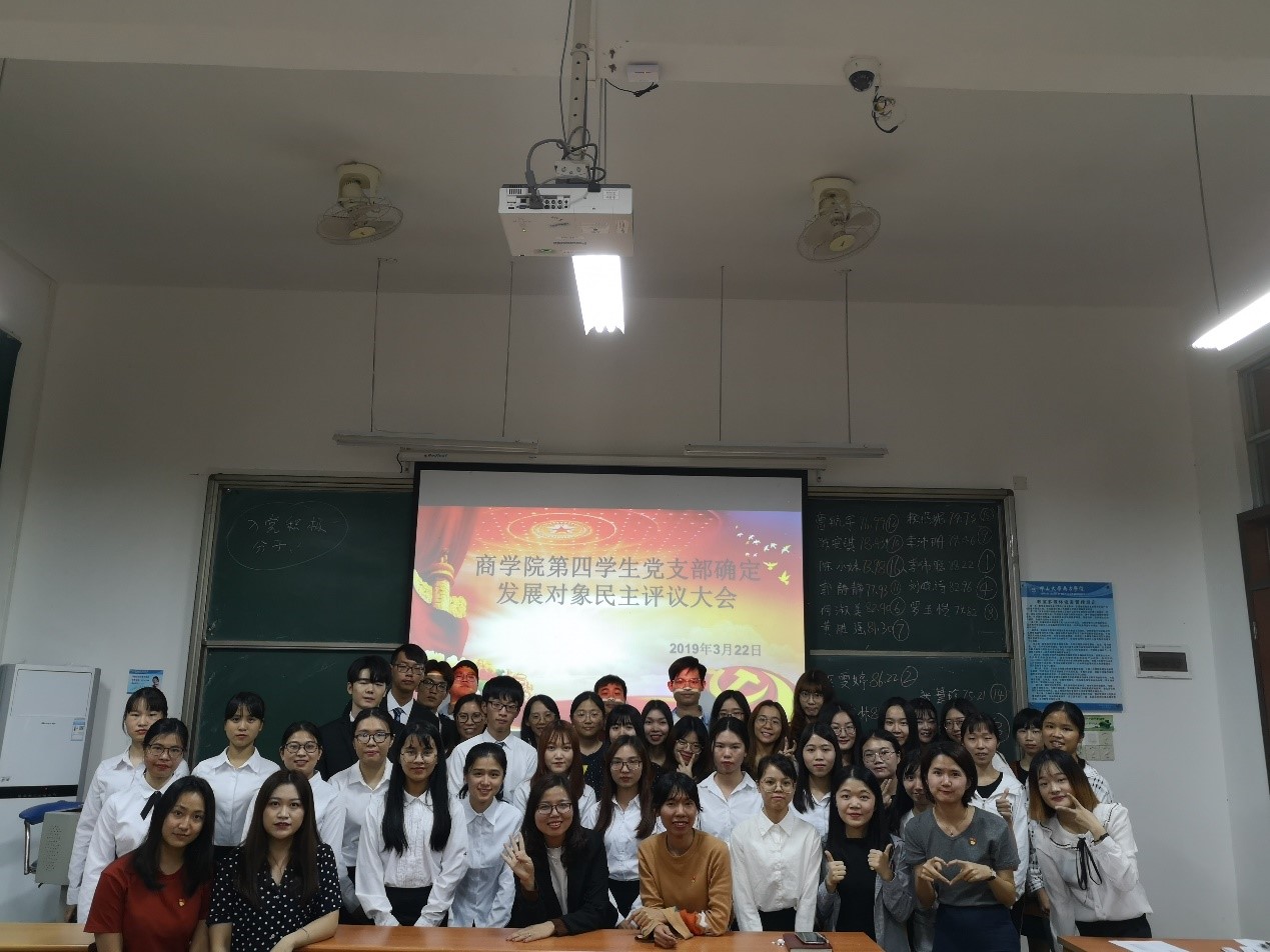 2019年3月22日晚上18:30,艾弗森贝博ballbet官网第四学生党支部确立发展对象民主评议大会于8教205隆重召开。参与大会的人员有第四学生支部书记韩露老师,副书记张燕老师,支部学生党员,预备党员以及发展对象候选人。会议由代理宣传委员黄舒琪同志主持。