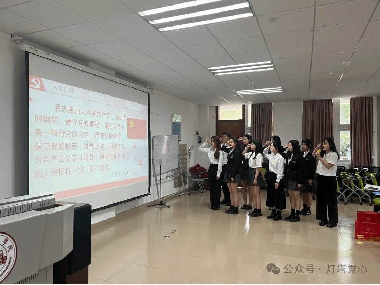 会议的第二项议程为重温入党誓词。由党建工作助理刘颖同志领誓,新一批党员举起右拳,面向党旗庄严宣誓。随后,党支部书记邓莉老师为新接收的预备党员佩戴党员徽章,并颁发纪念贺卡。