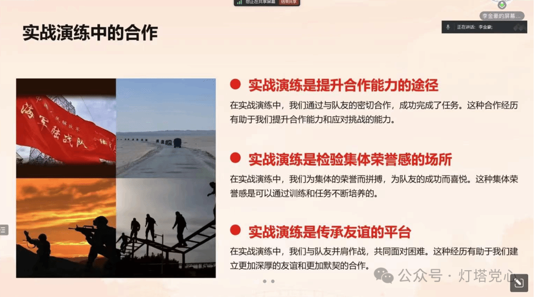 紧接着,卢文杰同志以《英雄的加勒万》歌曲作为引入,带领党支部成员们回顾了2020年6月发生的加勒万河谷冲突事件。通过分享英雄们的战斗日记,请战书内容以及其他士兵的战场回忆的方式,从一个全新的角度让党支部成员们更加深刻地了解英雄,敬仰英雄,怀念英雄。英雄们在面对敌人时的坚定信念和无畏勇气,充分展现了官兵们上下同欲、生死相依的精神。是他们的牺牲和奉献,换来了国家的安宁和稳,也激励着党支部成员们勇担使命,为国家的发展贡献青春力量。