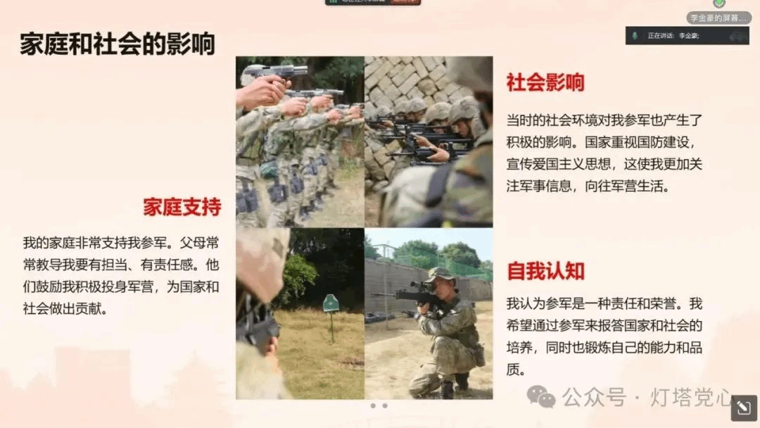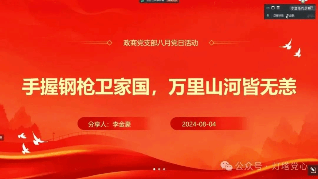 八一军旗,高高飘扬;八一军徽,熠熠生辉。97年来,英雄的人民解放军战士在祖国大地捍卫万里山河,守卫万家灯火,筑起钢铁长城。为进一步加强党支部成员的爱国主义教育,涵养家国情怀,增强奉献意识,砥砺奋斗精神,艾弗森贝博ballbet官网政商党支部于2024年8月4日晚20时通过线上腾讯会议的方式开展以“手握钢枪卫家国,万里山河皆无恙”为主题的党日活动。本次党日活动邀请了退伍士兵李金豪同志和卢文杰同志通过讲述自身故事和英雄故事的方式,为党支部成员们带来了一场别开生面的情景课,展现了火热军营的精彩与热血。党支部成员们积极报名,踊跃参与。
