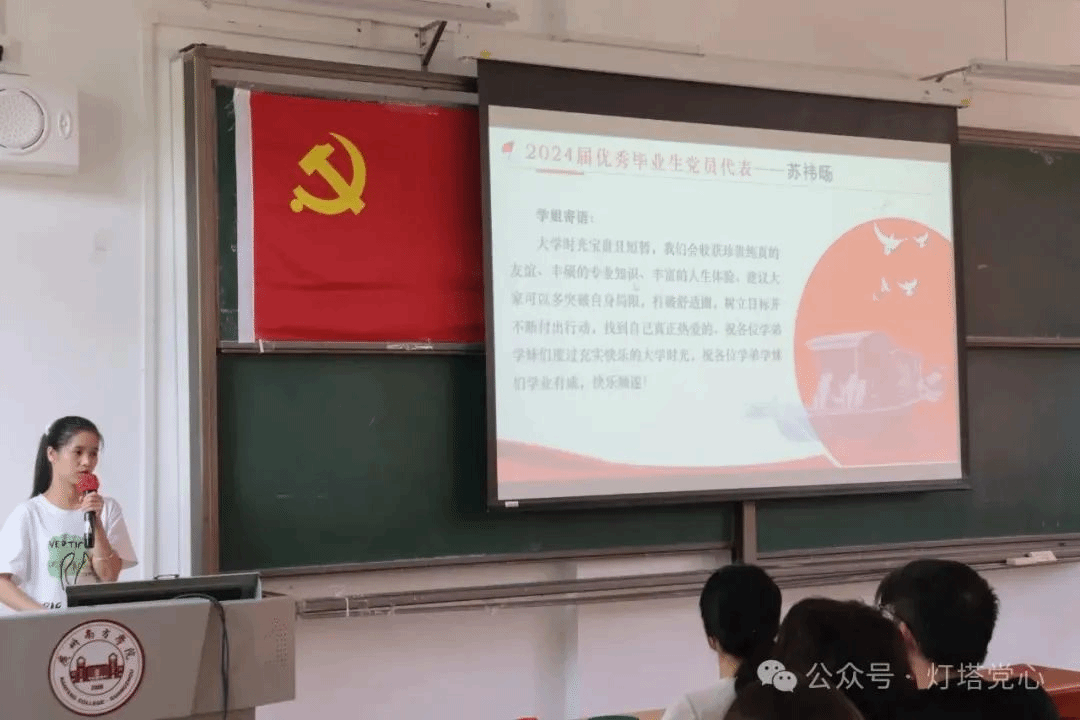 接下来,由周赖冰同志对党支部的基本概况和建设情况、入党流程及条件、入党申请书相关材料等内容进行介绍,并对新生提出的问题进行答疑。其中包括党支部的专业特色、制度建设情况、品牌建设情况、特色活动情况、党员风采五大部分。此外,她还介绍了党支部2024届优秀毕业生党员代表苏祎旸同志。学姐寄语道:“大学时光,珍贵而又短暂。在这里,我们能够收获珍贵纯真的友谊,汲取丰硕的专业知识,积累丰富的人生体验。建议大家多多突破自身局限,勇敢地打破舒适圈,树立明确的目标并持续付出行动,努力去找到自己真正热爱的事物。衷心祝愿各位学弟学妹们度过充实而快乐的大学时光,学业有成,快乐顺遂。”