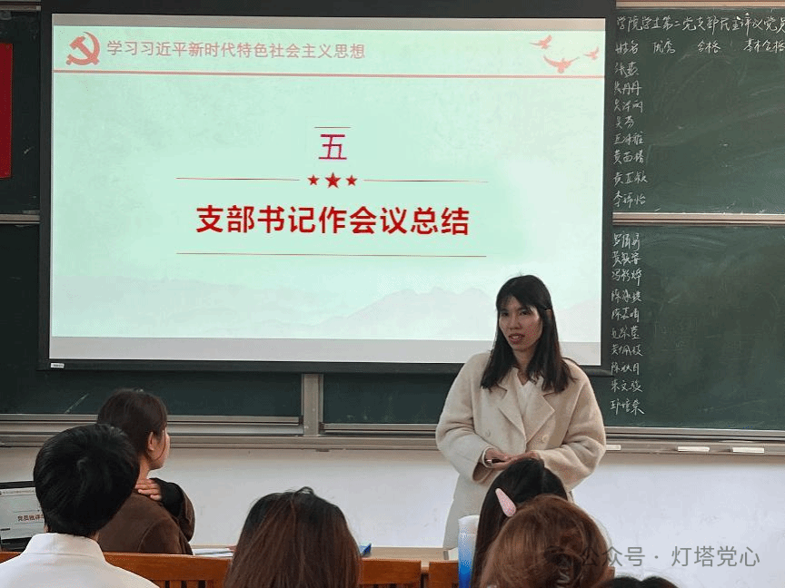 党支部副书记裴丹丹老师对一年来的党建工作成果进行汇报总结。裴丹丹老师指出,党支部始终坚定不移地贯彻党的领导,定期开展党小组会议和党课,确保了党建工作的规范性和完整性。在党纪学习方面,通过多维度的学习讨论和“线上+线下”相结合的模式,有效强化了党纪条规的掌握。在组织建设方面,党支部设立了专职队伍和明确的责任清单,完善了督查机制和管理制度。在党建品牌建设上,以“雁起流溪”党建模型为核心,“七个有力”为导向,创新活动形式和内容,提升党员的党性修养和实践能力。她表示,未来党支部将继续总结经验,推广成功的工作做法,全面深化党建工作,努力打造一个更加坚强有力、务实创新的党组织。