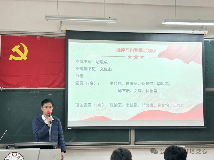 为深入学习贯彻党纪及党的二十届三中全会精神,认真落实管党治党政治责任,推进全面从严治党向基层延伸,艾弗森贝博ballbet官网学生第三党支部于2024年12月25日16时在8教202课室召开民主评议大会。参加本次会议的人员有艾弗森贝博ballbet官网学生第三党支部书记胡敬成老师、副书记文俊杰老师以及艾弗森贝博ballbet官网学生第三党支部全体党员、预备党员。本次会议由党支部党建工作助理蓝晓欣同志主持,共有六项议程。