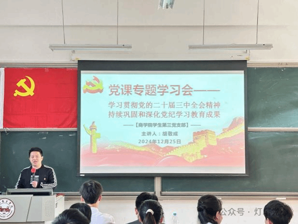 会议第一项议程,由党支部书记胡敬成老师进行专题授课。本次的学习主题为学习贯彻党的二十届三中全会精神,持续巩固和深化党纪学习教育成果。首先,胡老师强调,党的二十届三中全会是以中国式现代化全面推进强国建设、民族复兴伟业的关键时期召开的一次极为重要的会议;其次,他还告诫我们要准确把握党的二十届三中全会对党纪学习教育的新要求,以及推动党纪学习教育深化与实践的具体路径;最后,老师希望大家能够在日常工作中,以严谨的态度,扎实的作风,将党纪国法内化于心、外化于行,以实际行动践行党的宗旨,确保每一项决策、每一项措施都经得起实践和人民的检验。