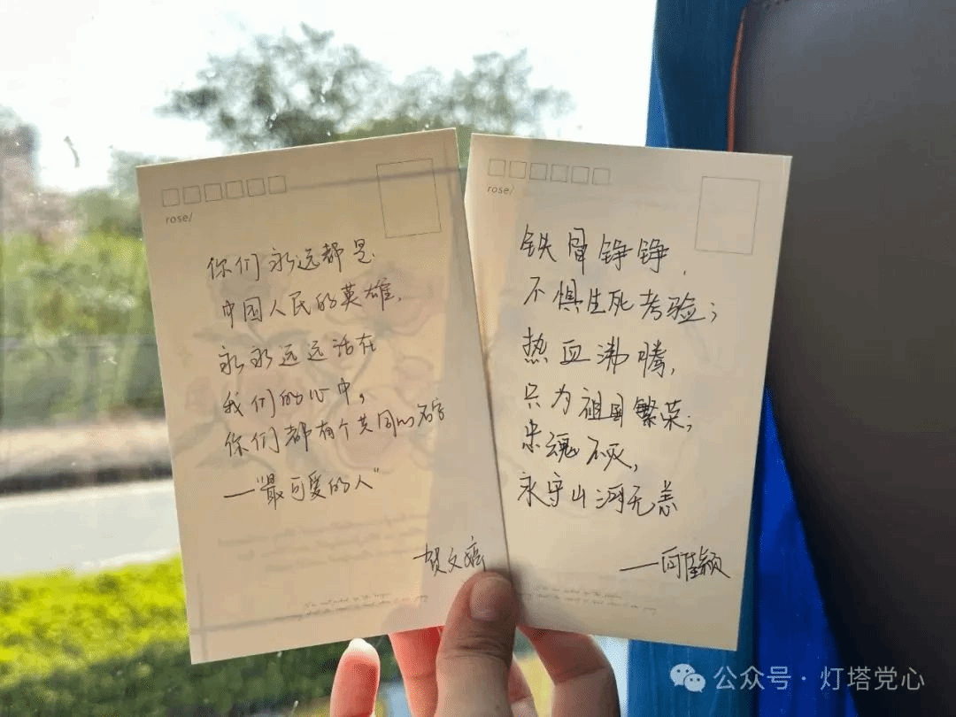 在返回学校的途中,每位党支部成员领取了一张明信片,静下心来给革命先烈写一封信。大家在明信片上分享着如今的盛世繁华、个人成长的困惑,以及立下的奋斗志向。这是一场跨越时空的对话,是我们对先烈的深情告白,也是我们对未来的庄严承诺。
