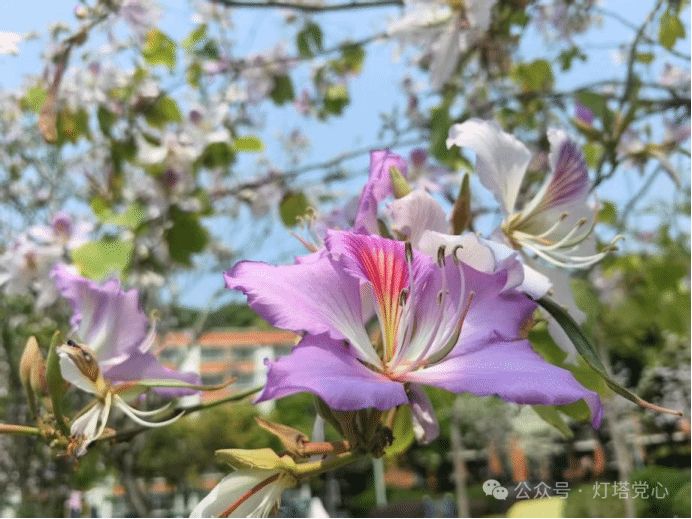 粉白淡紫间,一朵紫瓣盈盈,红脉点缀