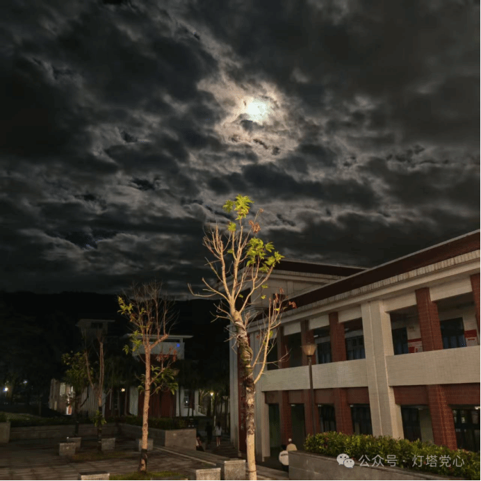 楼前静立枝叶在风中轻颤,似在与月光低语