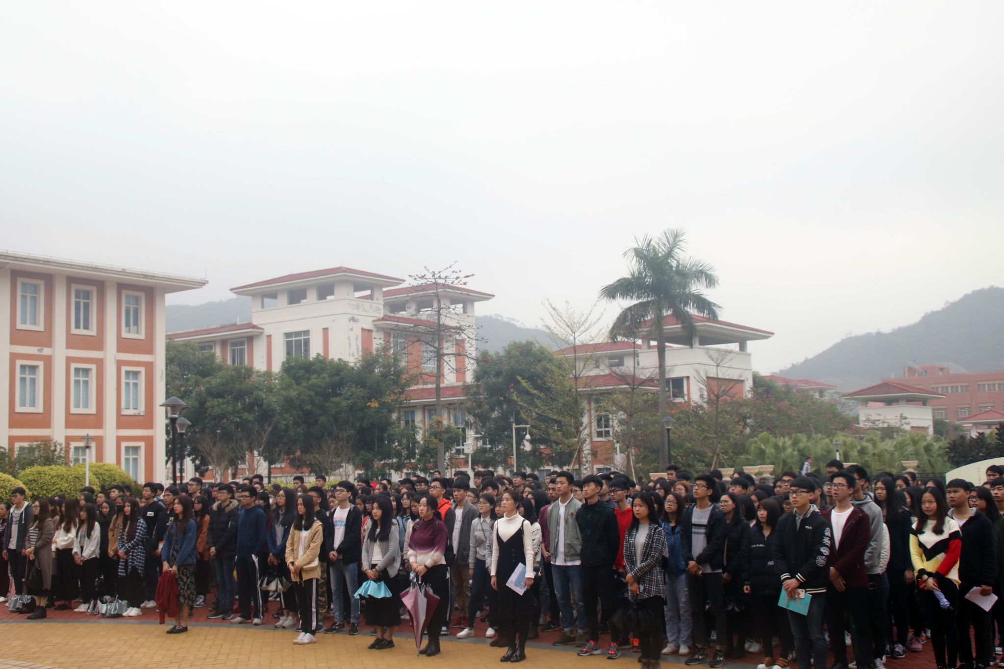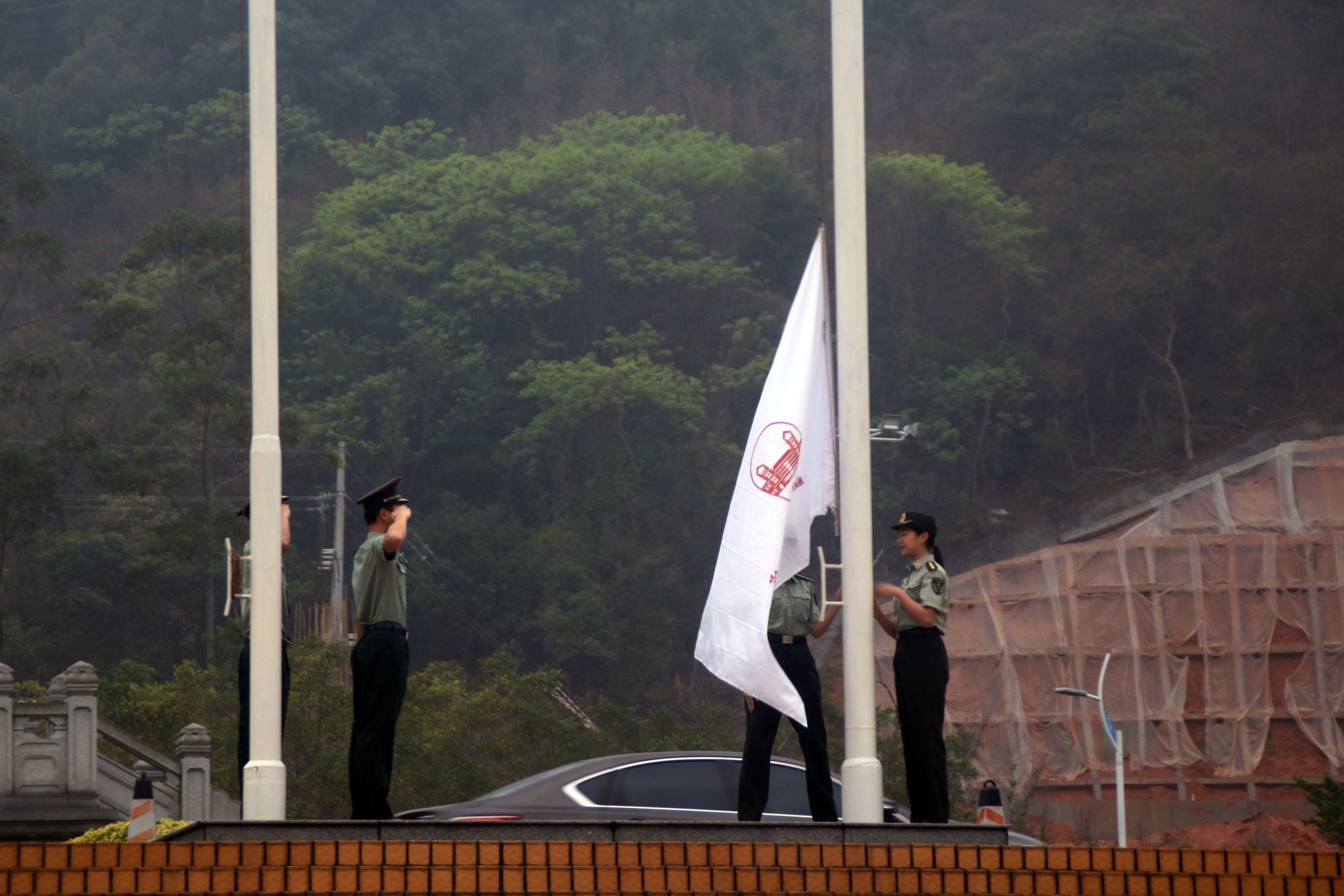 鲜红的五星红旗飘扬于空中,抖擞的军姿彰显了一代青年的英姿。肃穆、敬畏油然而生。“南风薰兮,珠水流长。依山带河,绿树红墙。”校旗伴随着校歌缓缓升起。