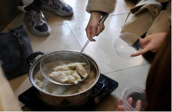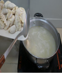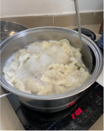 接下来到了煮饺子的环节,一盘排列整齐的饺子滑入滚水中,饺子在水中上下翻腾,它们逐渐变得透明,馅料的轮廓隐约可见,散发出诱人的香气