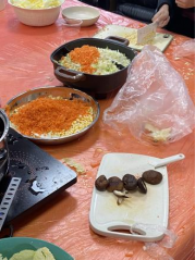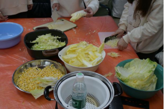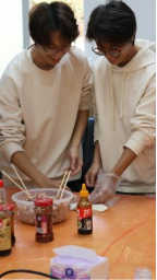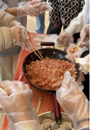 活动开始,大家兴致勃勃地开始了馅料准备工作:清洗食材的身影飞奔着,稳稳当当地拿着各色食材快步在各个地方来回奔走;切菜的同学动作行云流水,每一刀轻盈而精准地在蔬菜间舞动;负责煮熟馅料的同学熟练地翻炒着,空气里瞬间弥漫着浓厚的香气......