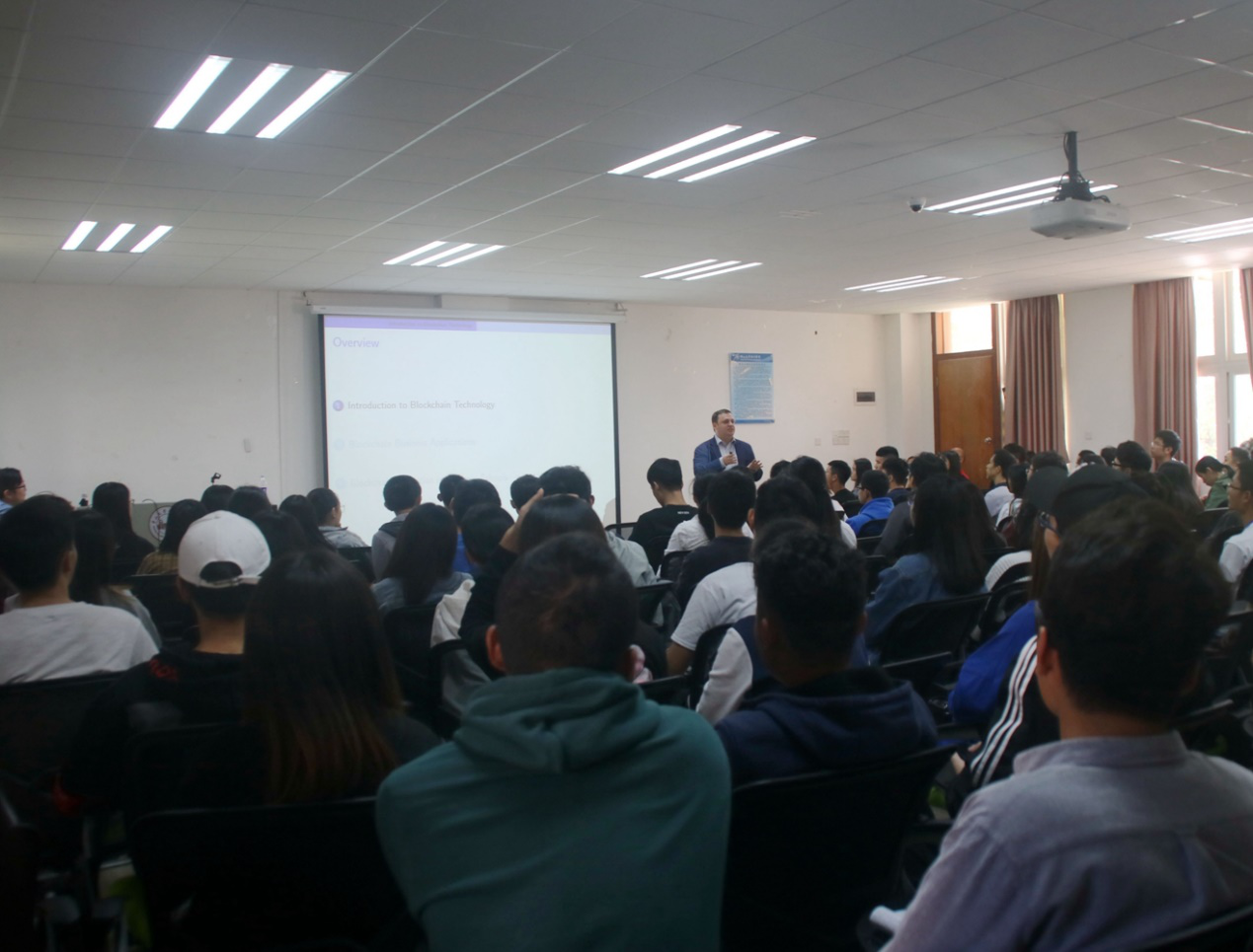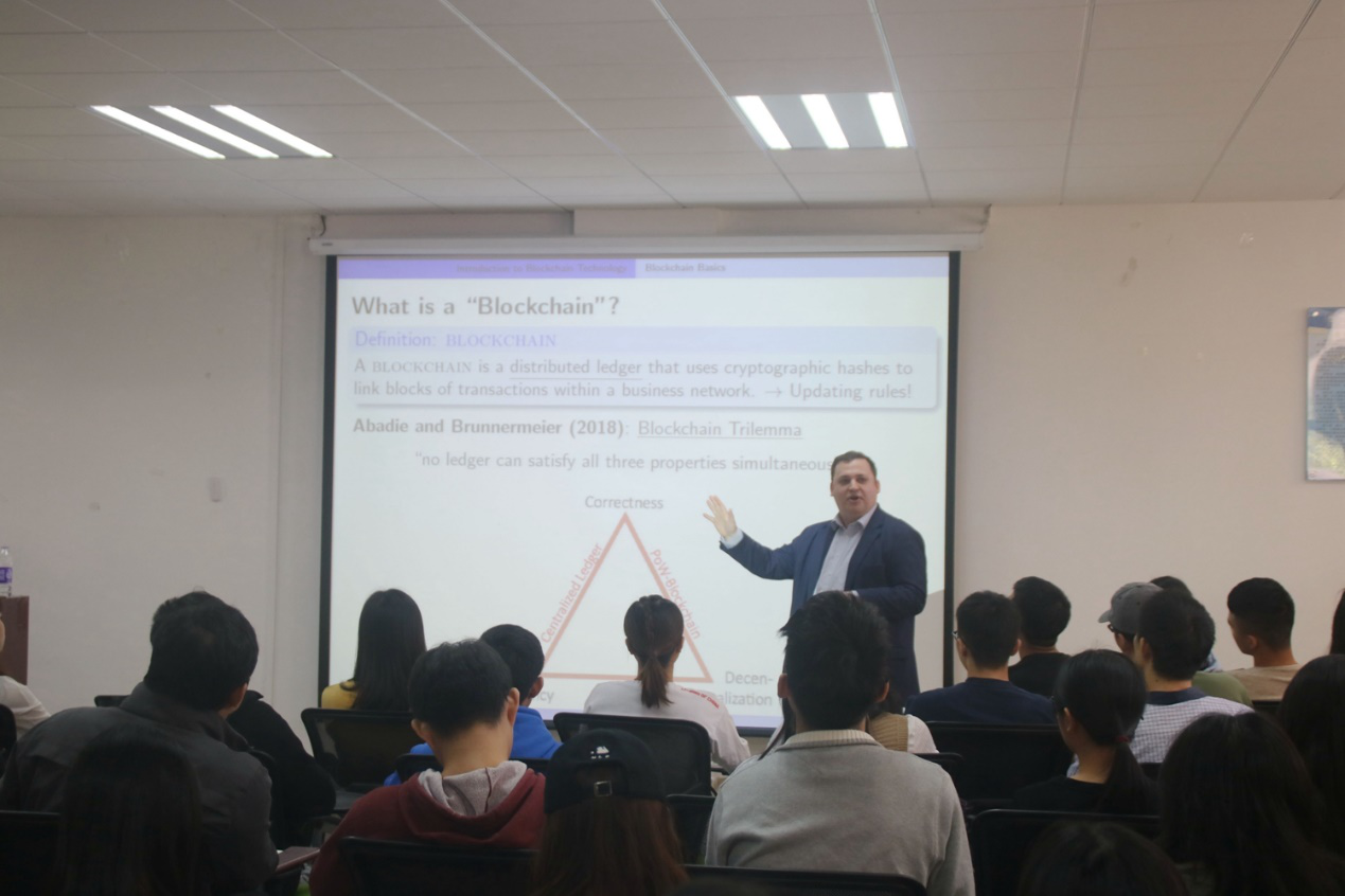 会议开始,Felix Irresberger副教授为同学们简要介绍了区块链的产生缘由与发展过程。并且举例了区块链技术的实际应用,使同学们更深入地理解区块链技术。同时,Felix Irresberger副教授也向我们介绍了区块链商业化的发展以及其业务发展,并运用了详实的数据展现了区块链相关专利数量,清晰地展现了中国在区块链领域跨越式的发展优势。