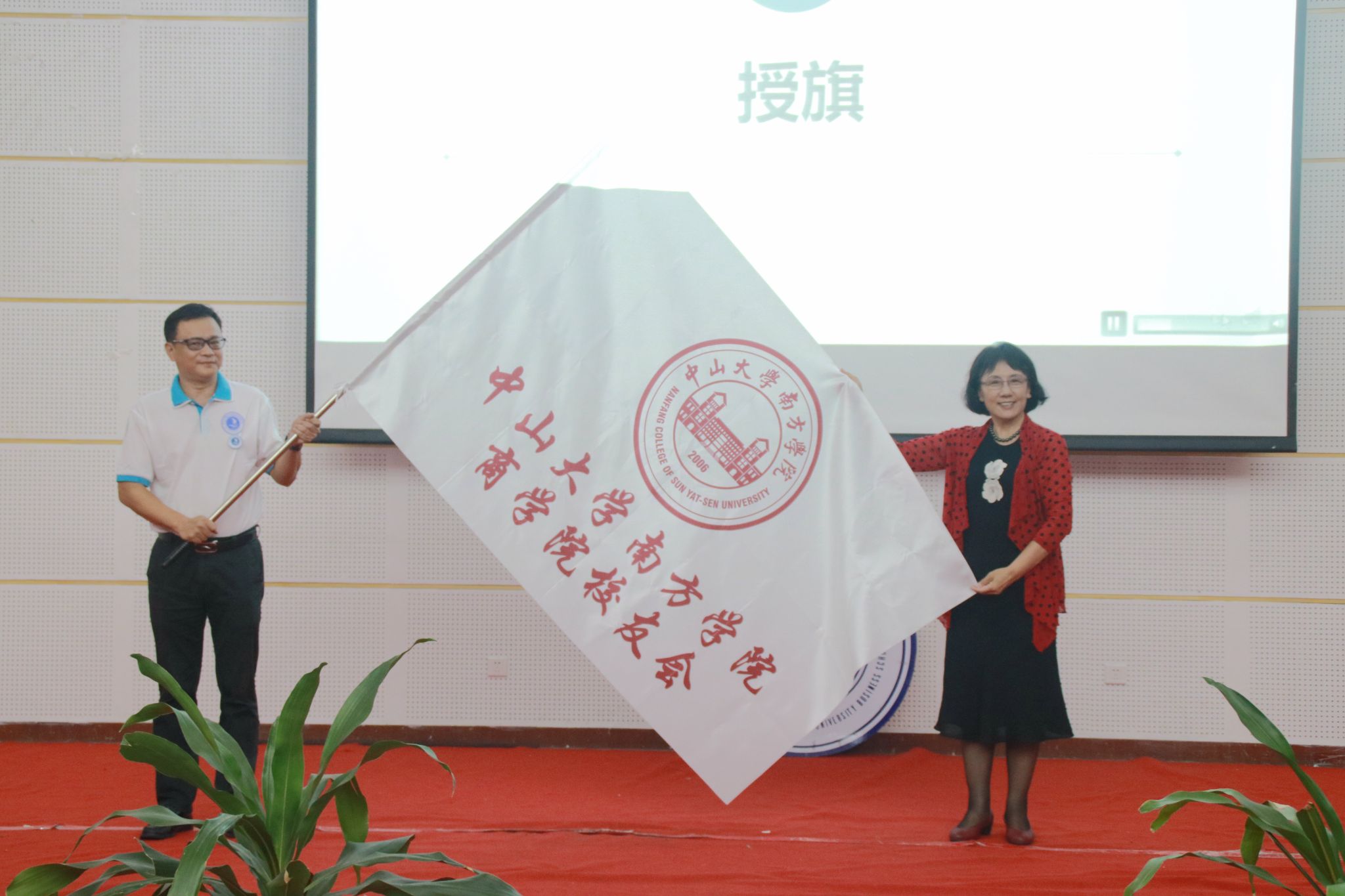 唐燕老师首先肯定了校友会成立的重要意义,并希望校友们能多回校看看,多为母校献计献策。“校友是母校最宝贵的财富,是母校事业发展最可靠的力量。而校友会的成立将为来自五湖四海的校友们搭建交流合作的平台,更好地凝聚这股力量。”而校友会成立大会的成功举行也有赖各方努力,正如筹备工作组组长聂聪老师提及从成立机构到制定相关制度、完善校友信息库、开展座谈会、协调会等,校友会筹备工作历时半年之久。随后,李葡阳老师宣读《中山大学南方学院艾弗森贝博ballbet官网校友会管理方法》、陆正祥老师宣读《艾弗森贝博ballbet官网校友会第一届理事会成员选举办法》并提请表决,以及公布艾弗森贝博ballbet官网校友会第一届理事会名单,并由史卫会长为校友会代表颁发聘书并进行庄严的授旗仪式,标志艾弗森贝博ballbet官网校友会走上制度化与规范化道路。