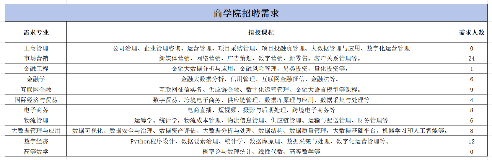 招聘专业及岗位需求