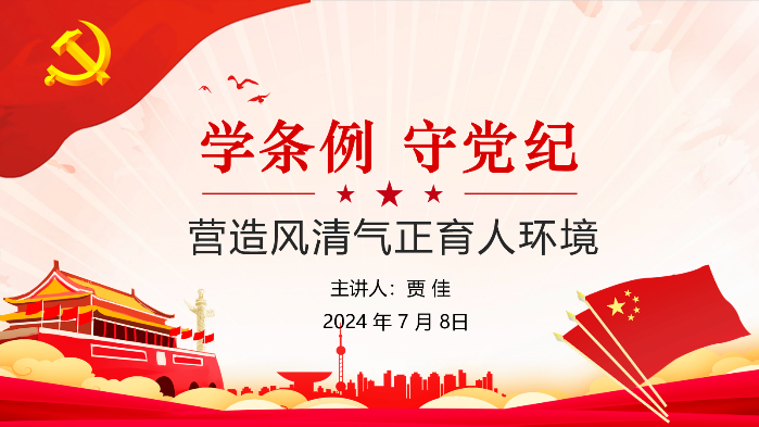 会上,贾佳书记带领大家重温《中国共产党纪律处分条例》(以下简称《条例》)的重要内容,结合典型案例详实地对“政治纪律、组织纪律、廉洁纪律、群众纪律、工作纪律、生活纪律”展开了讲解,突出学习《条例》的重要意义,提出要做政治清醒的“明白人”,做清正廉洁的“干净人”,做担当实干的“带头人”,做为民服务的“贴心人”。