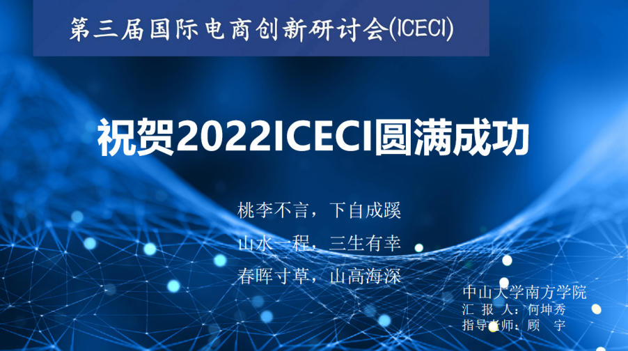 国际电商创新研讨会(ICECI)是中国信息经济学会电子商务专业委员会主办的国际性电子商务研讨会,第三届会议于2022年7月9日在中国西安以线上+线下会议的形式召开。会议邀请了美国华盛顿大学、美国加州大学、芬兰坦佩雷大学、西安交通大学、厦门大学等国内外高校知名教授及京东、中邮等企业高层进行主题演讲,是一个高规格的国际性电子商务盛会。