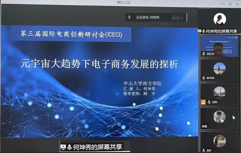 何坤秀同学作为会议中年龄最小、本科学历的参会成员,以自己本科毕业论文《元宇宙大趋势下电子商务发展探析》做为参会论文,从传统电商到兴趣电商发展的瓶颈问题分析,到元宇宙的兴起,从元宇宙技术发展及给电商带来的机会,提出“以技术优化体验”、“新技术,新媒介,新场景,新渠道,引导新需求”两个主要观点,得到与会专家的认同。