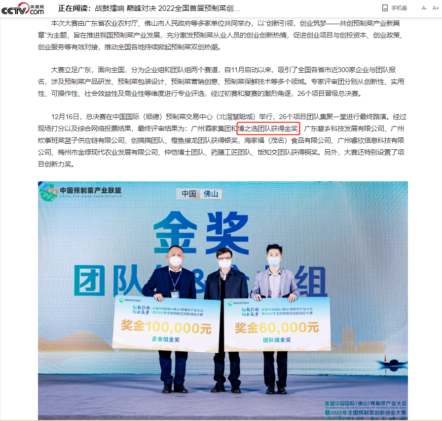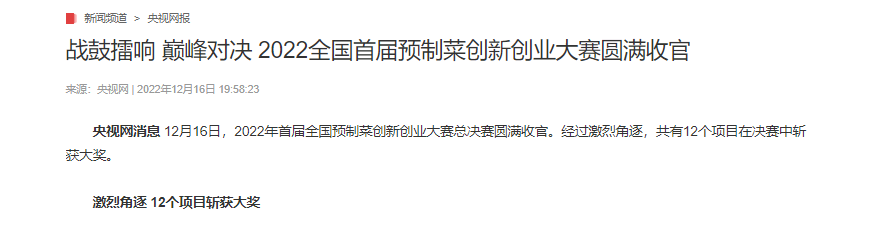 12月16日,2022年首届全国预制菜创新创业大赛总决赛圆满收官。经过激烈角逐,贝博官网博之选团队获得首届全国预制菜创新创业总决赛金奖。