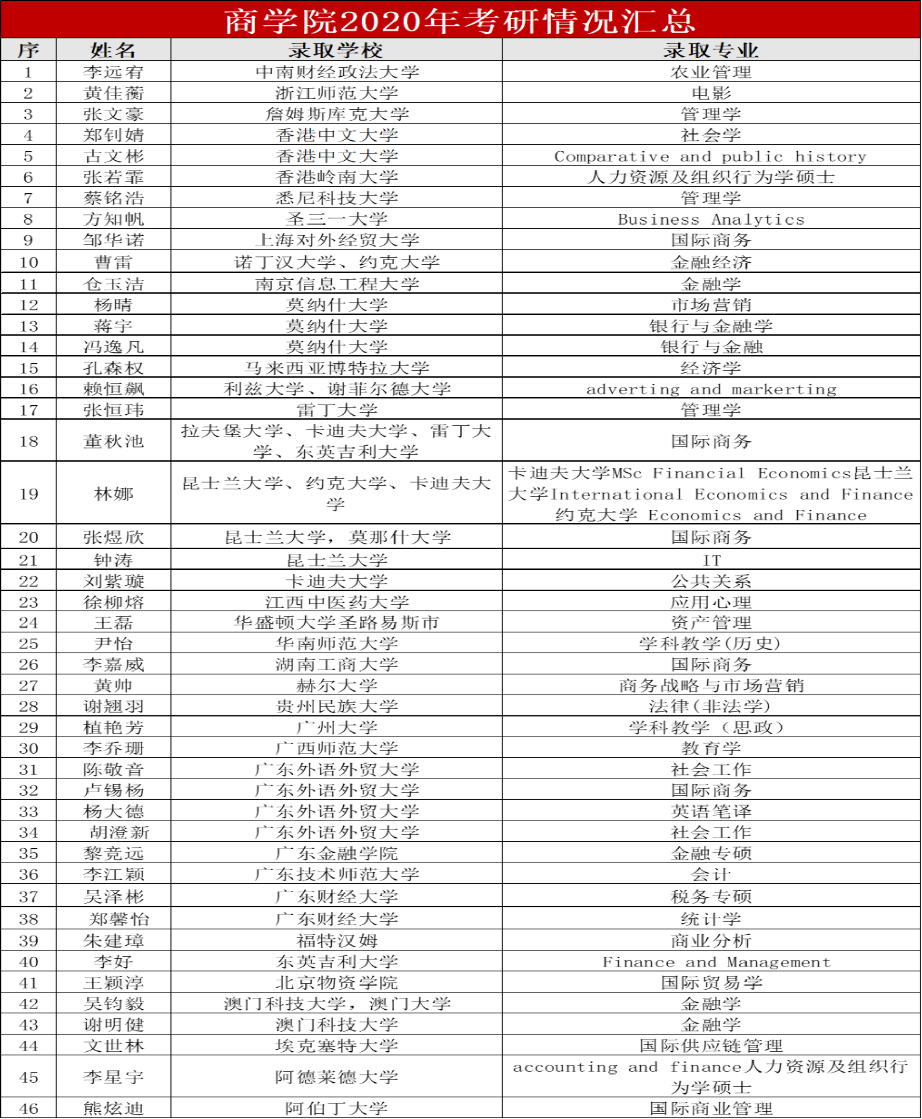 2021年全国研究生考试已经落下帷幕,艾弗森贝博ballbet官网艾弗森贝博ballbet官网共有46名学子被录取,成功上岸。录取的高校有中南财经政法大学、上海对外经贸大学、香港中文大学、约克大学、诺丁汉大学等国内外知名高校。
