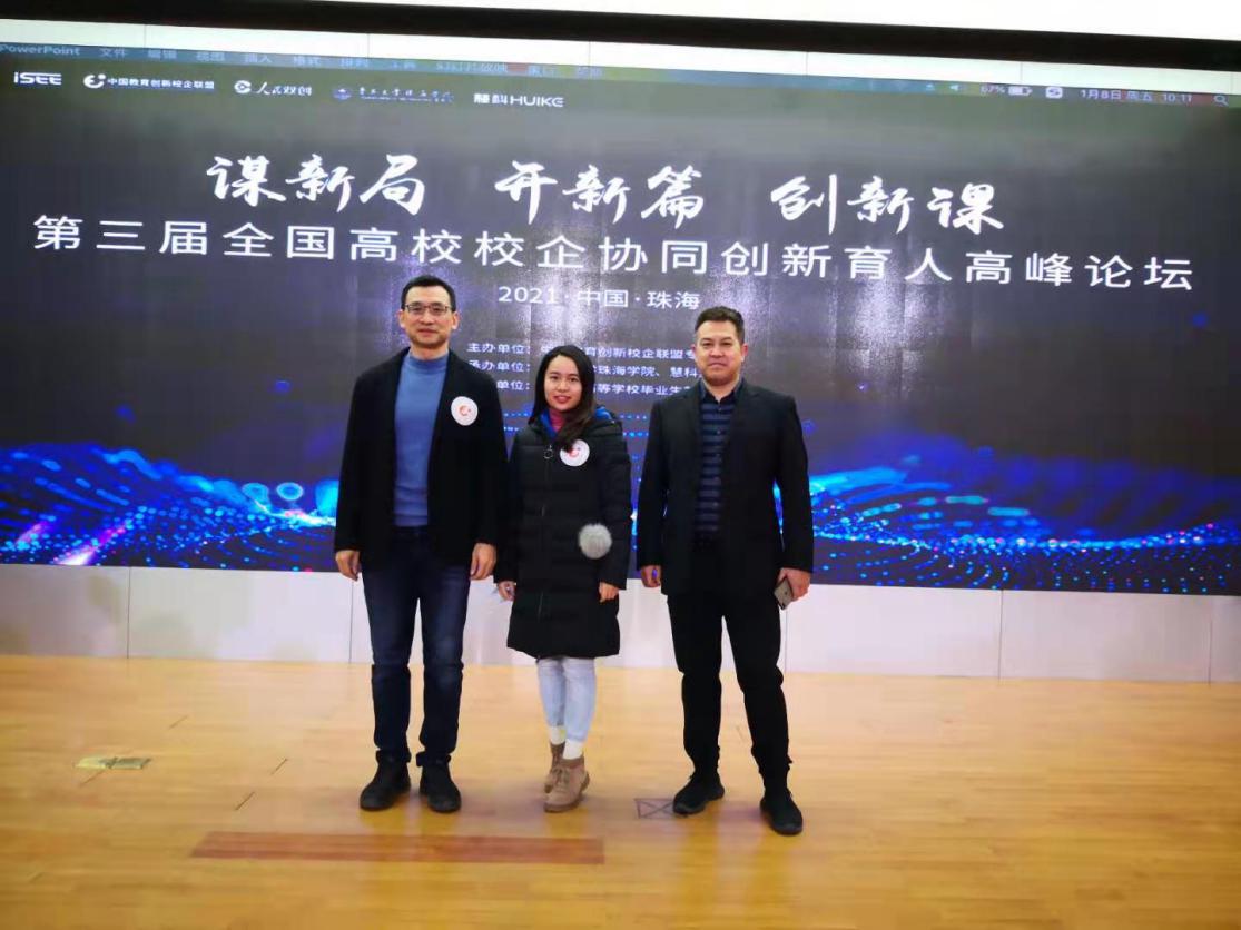 为了加快高等教育内涵式发展,全面提高人才培养质量,进一步推动创新创业教育与专业教育紧密结合,提升协同创新服务能力,2021年1月7日至1月10日,贝博官网甘宏副教授、李维国老师和梁洁敏老师赴珠海参加由中国教育创新校企联盟专委会主办,吉林大学珠海学院与慧科集团承办的“第三届全国⾼校校企协同创新育⼈⾼峰论坛”活动。