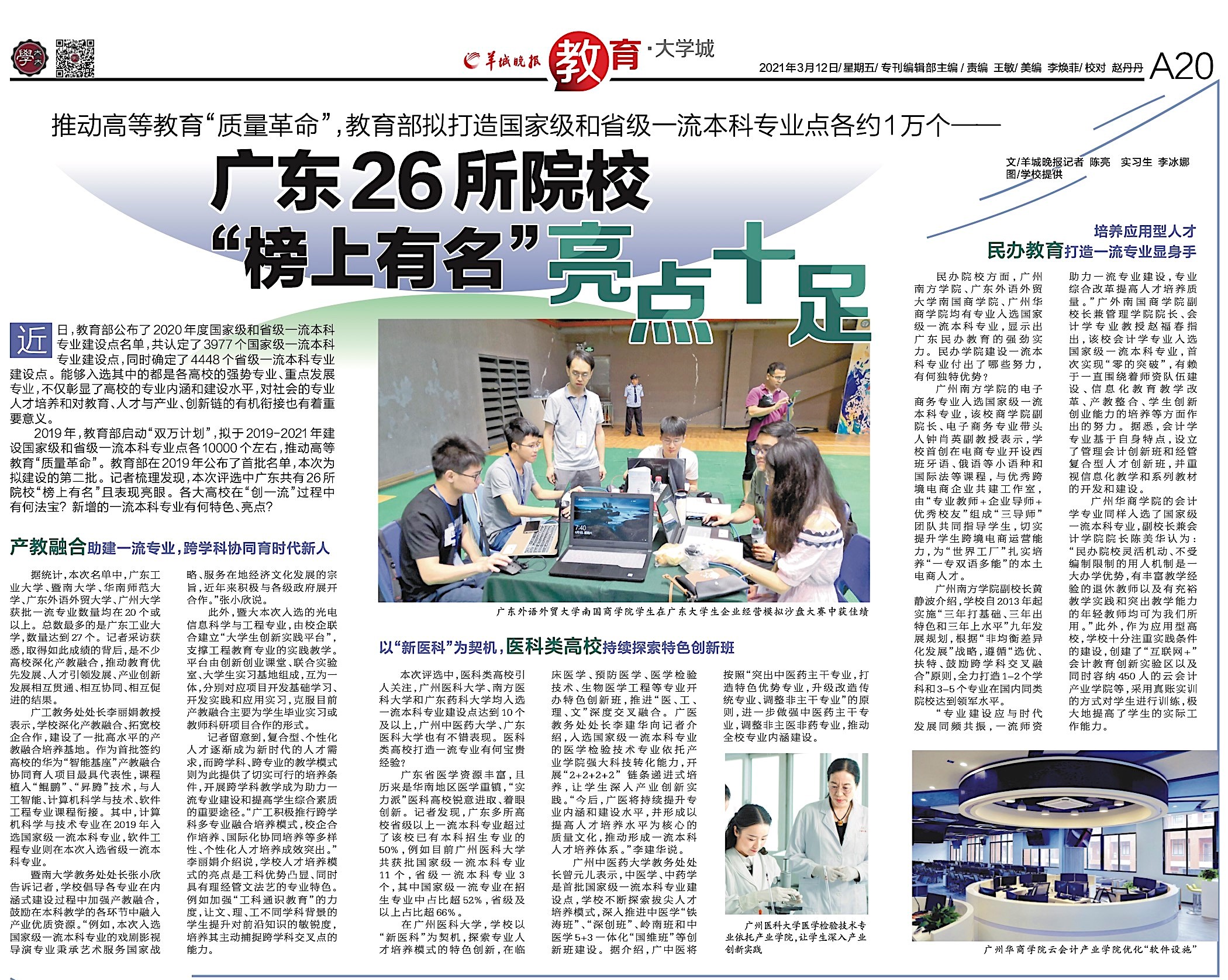 3月12日,《羊城晚报》刊发长篇报道,介绍广东省高等院校入选国家级和省级一流本科专业建设点情况,我校副校长黄静波教授、艾弗森贝博ballbet官网副院长、电子商务专业带头人钟肖英副教授接受了记者采访,介绍我校连续两年入选国家级一流本科专业建设点名单,入选数量在全省同类院校排名第一的情况。